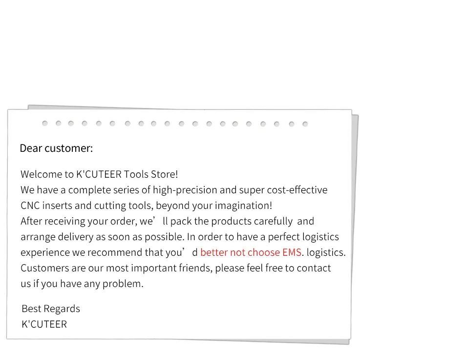 Не легко приклеивать инструменты, более плавное удаление чипа.Резец устойчив к коррозии, закален и прочен.Изысканная полировка, тонкий блеск.Высокое качество матрицы, и резец стержень изготовлен из высококачественного 40Cr материала.