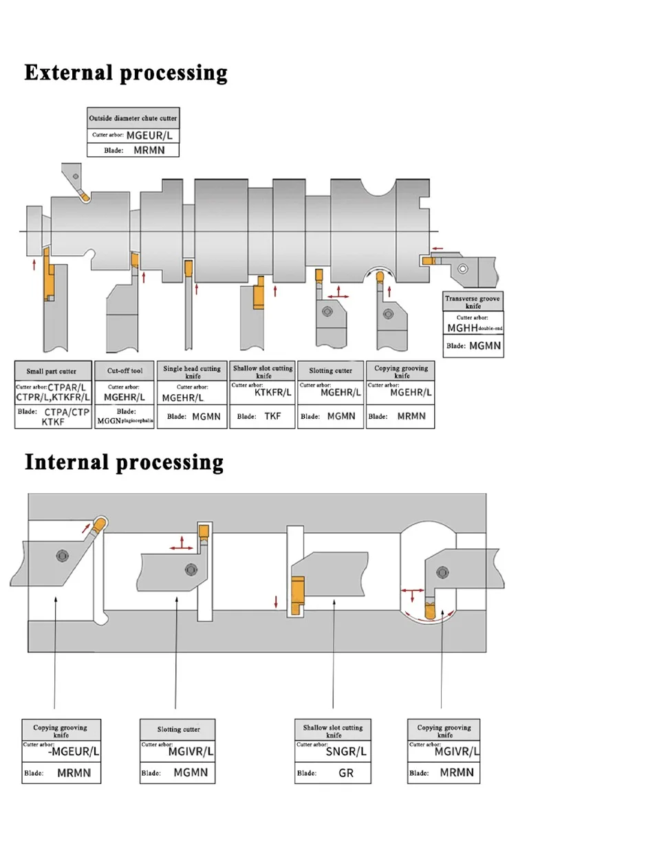 ①Параметры спецификации вставки и Производительность станка должны бытьРассмотрено (Fmax = wx0.075).②Скорость подачи не должна превышать радиус угла вставки.③В процессе обработки канавок проблема удаления чипа может быть решена с помощью небольшой глубины резкиИ пошаговая обработка.