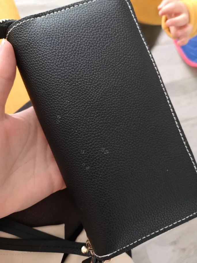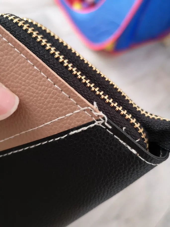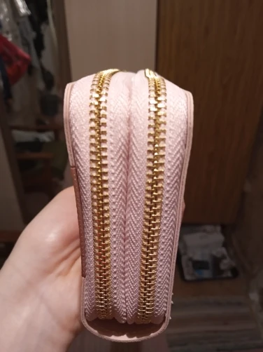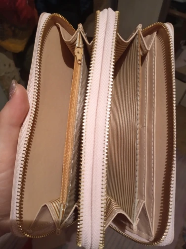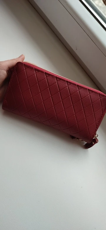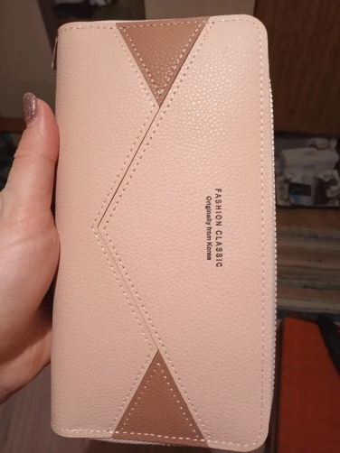 Товар пришёл очень быстро. Кошелёк удобный и вместительный, покрытие приятное не испорченное. Положили в подарок резинку для волос.