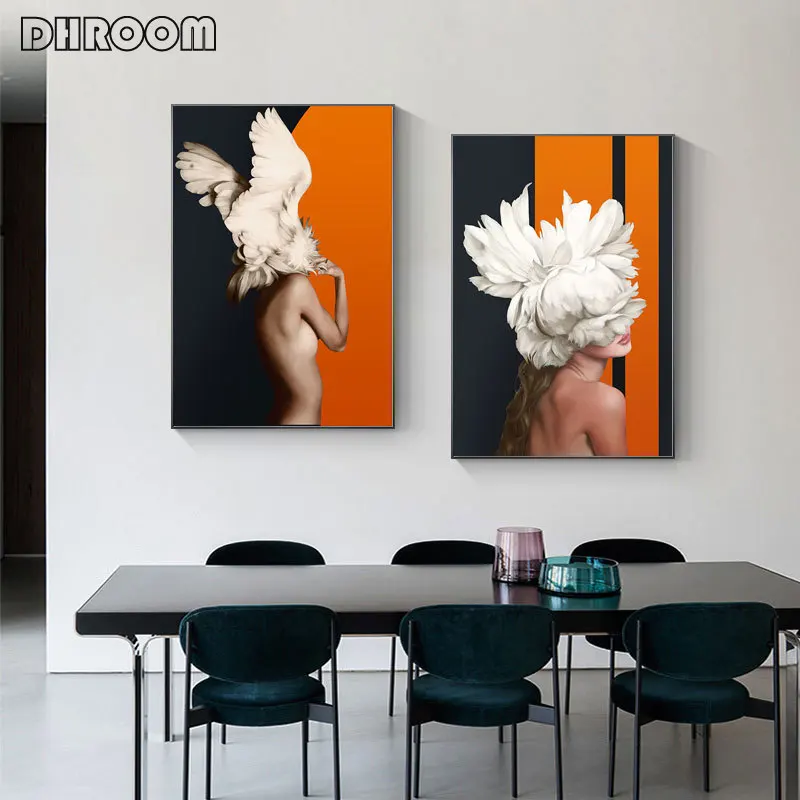 Абстрактная Картина на холсте с изображением женщины, цветов и перьев, красивый настенный плакат, печать в скандинавском стиле, оранжевая Настенная картина, украшение для гостиной