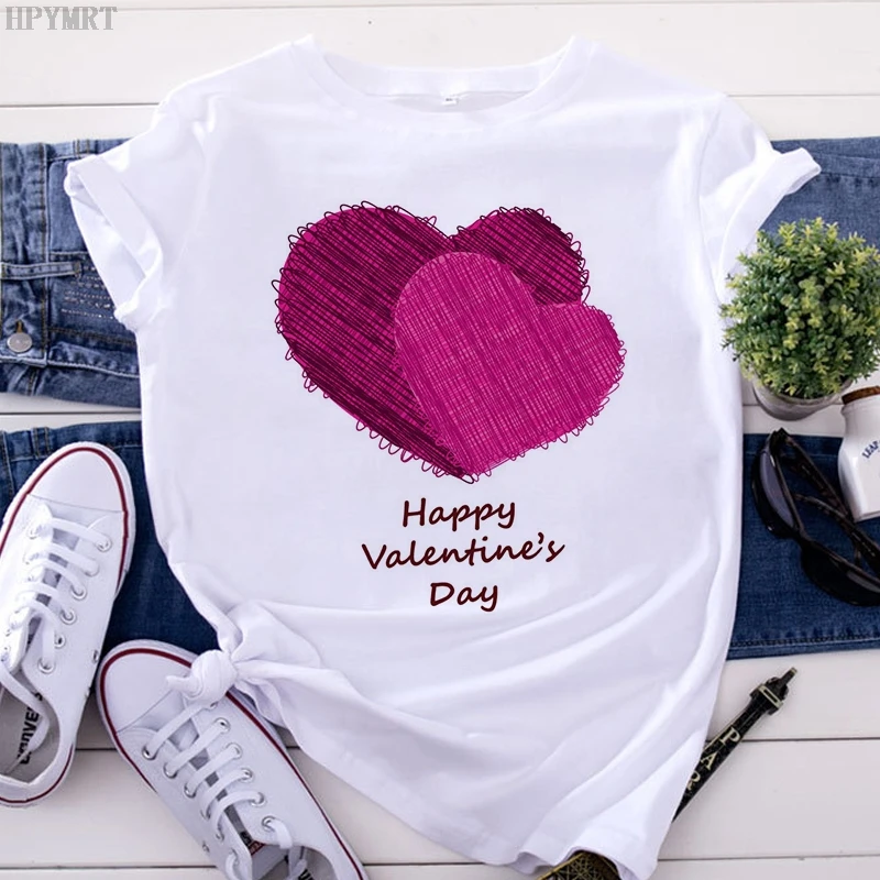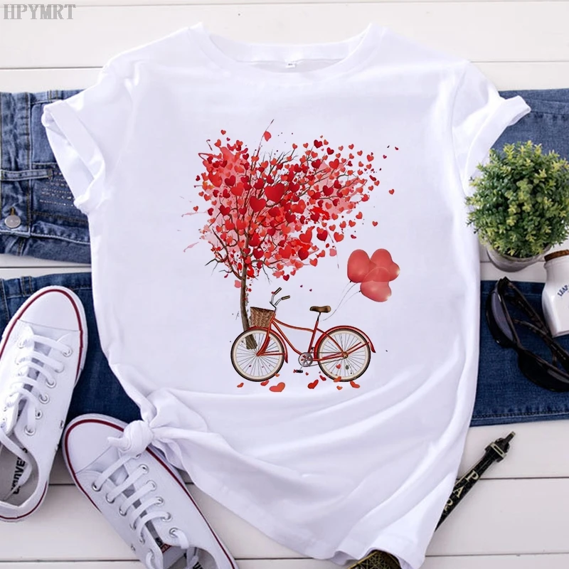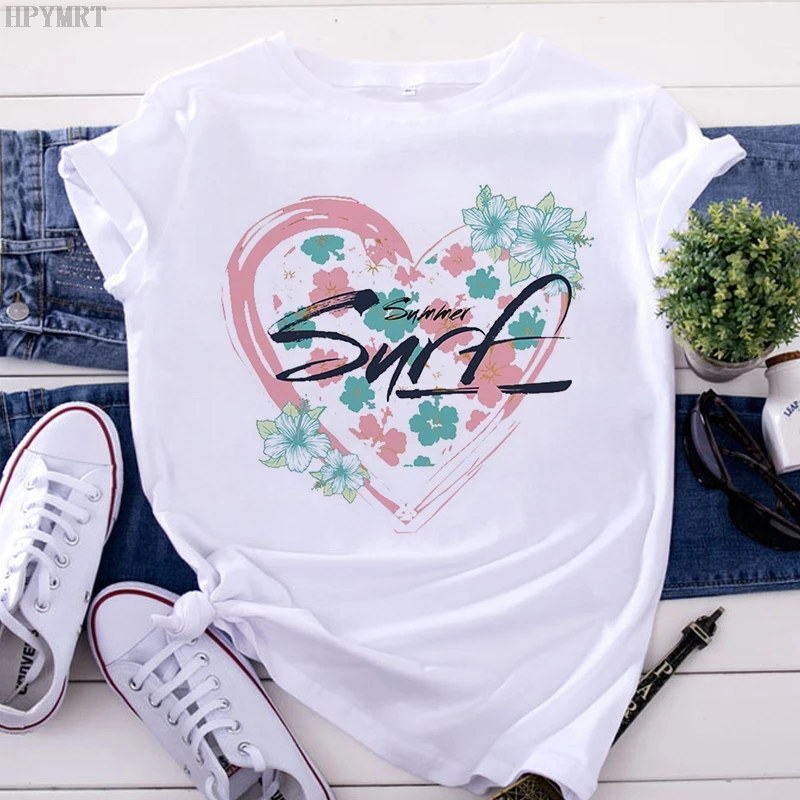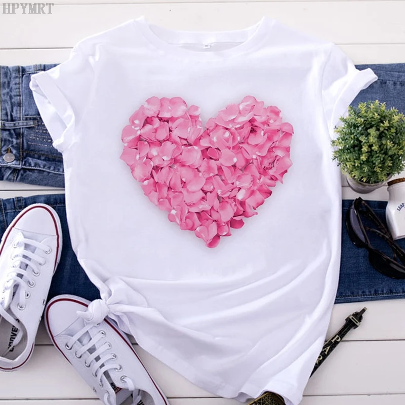 Футболка женская с коротким рукавом, Повседневная модная рубашка с принтом РОЗОВОГО СЕРДЦА и цветов в стиле Харадзюку, Топ большого размера, одежда на лето