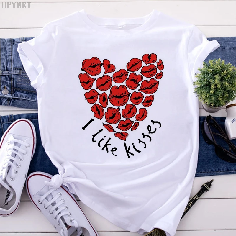 Футболка женская с принтом губ, модный топ с круглым вырезом и коро...