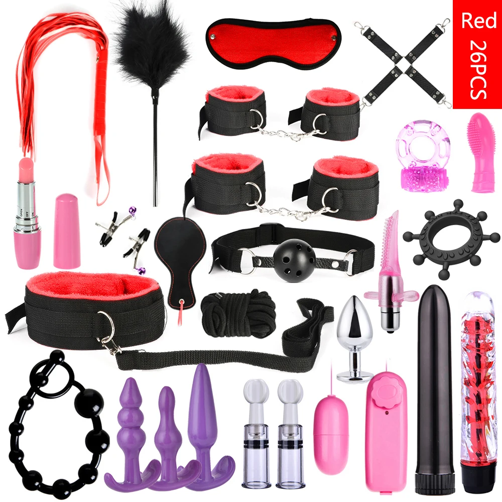 Набор для бондажа интимные игрушки для взрослых женщин и мужчин, 26 шт., наручники, зажимы для сосков, кнут, рот, кляп и веревка, фаллоимитатор, вибратор, эротические игрушки