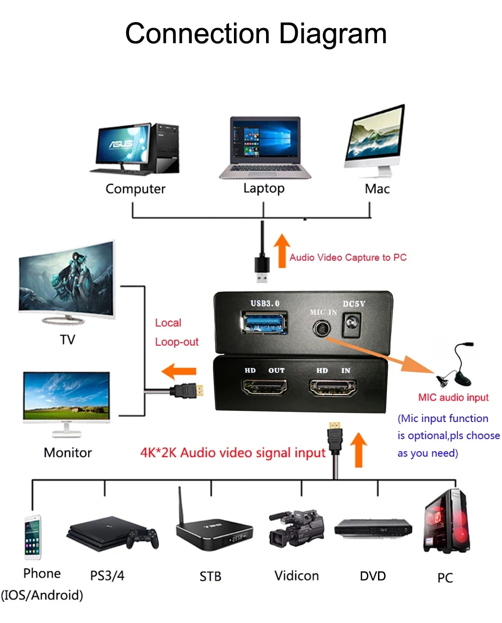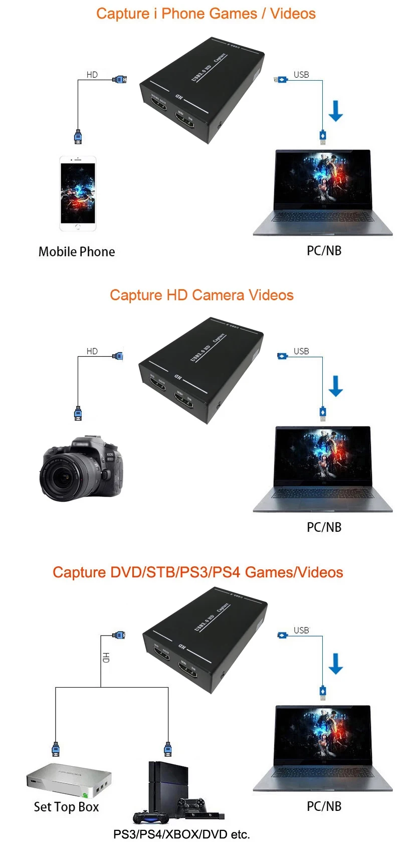 -Хост-Интерфейс: USB 3,0-Видеовход: совместим с HDMI-Аудиовход: HDMI-совместим, микрофон (стерео разъем 3,5 мм)-опционально-Видеовыход: HDMI-совместим-Аудиовыход: HDMI-совместим-Входное и Локальное разрешение выходного контура: 720x480 (60p), 720x576 (50p), 1280x720p (50p), 1280x720p(60p),1920x1080 (50i), 1920x1080 (60i), 1920x1080 (24p), 1920x1080 (25p), 1920x1080 (30p), 1920x1080 (50p),1920x1080 (60p), 3840x2160(30p) ;-Разрешение захвата: макс. 1080p при 60 кадрах в секунду-Совместимость с программным обеспечением: OBS Studio (windows,OS X); Кодировщик Windows Media (Windows); Adobe Flash MediaLive-кодировщик (Windows, OS X); Реальный производитель плюс (Windows); VLC (Windows, OS X, Linux);Вещатель QuickTime (OS X); Проигрыватель QuickTime (OS X); Wirecast (Windows,OS X); vMix(Windows); Potplayer(Windows) ...Комплектация:1 * USB 3,0 HDMI-совместимая карта видеозахвата1 * кабель USB 3,01 * Руководство пользователя1 * USB кабель питанияНет коробки для рознипосылка. При необходимости сначала свяжитесь с нами