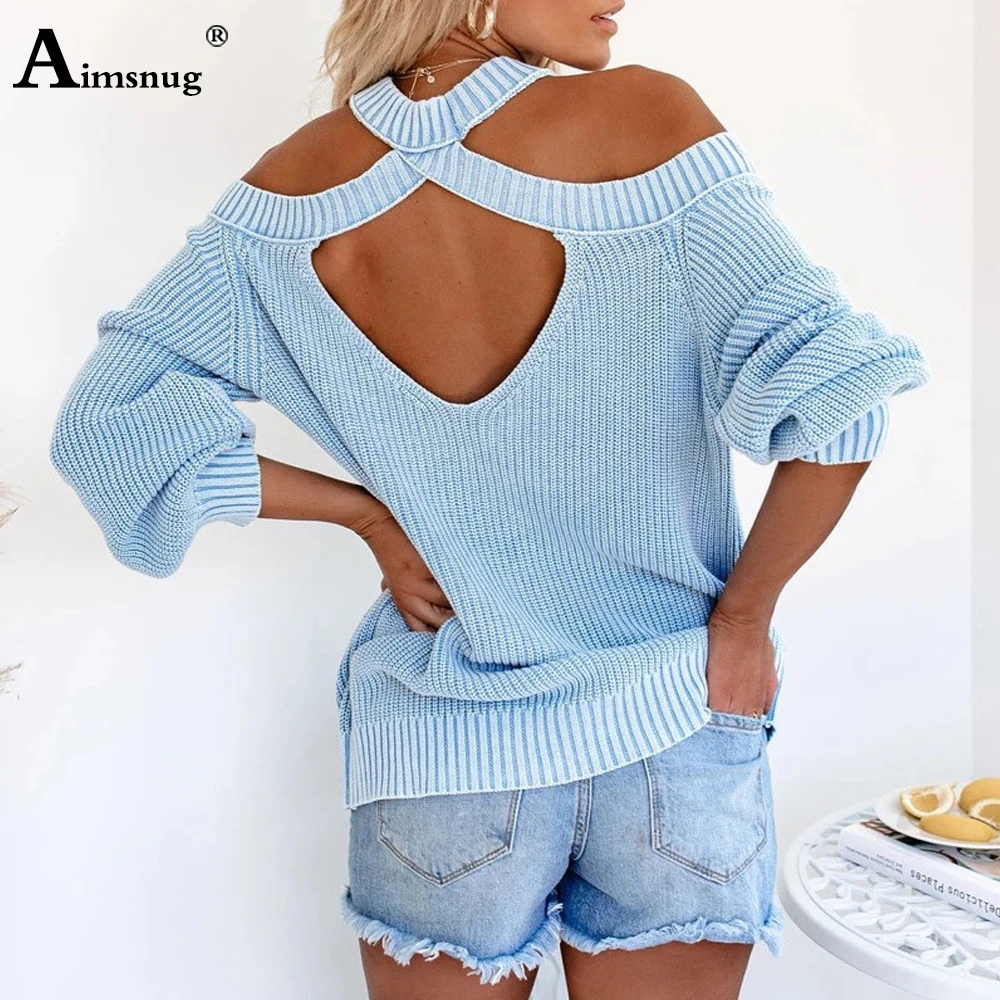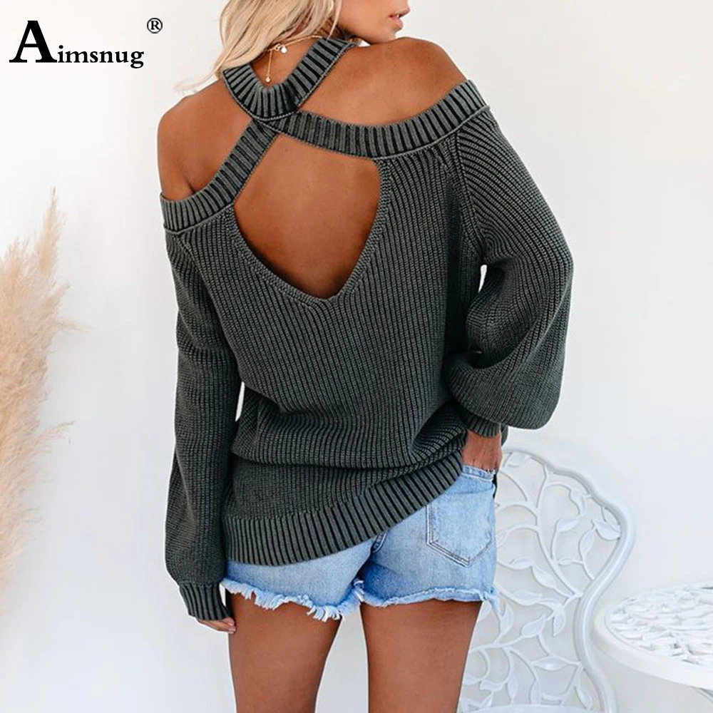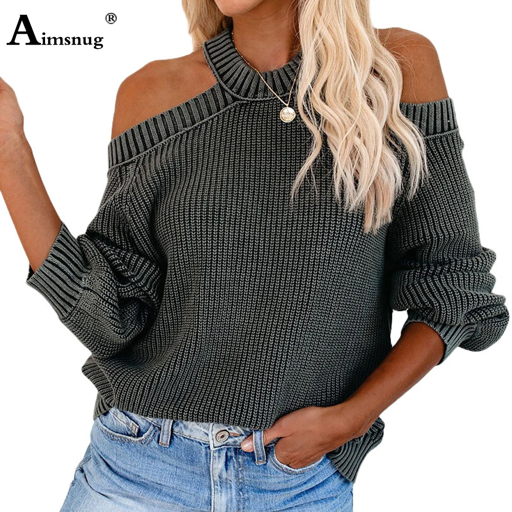 Aimsnug свитера с длинным рукавом и лямкой на шее пуловеры с вырезами на плечах свитер 2021 Осенняя мода женские Асимметричные вязаные топы