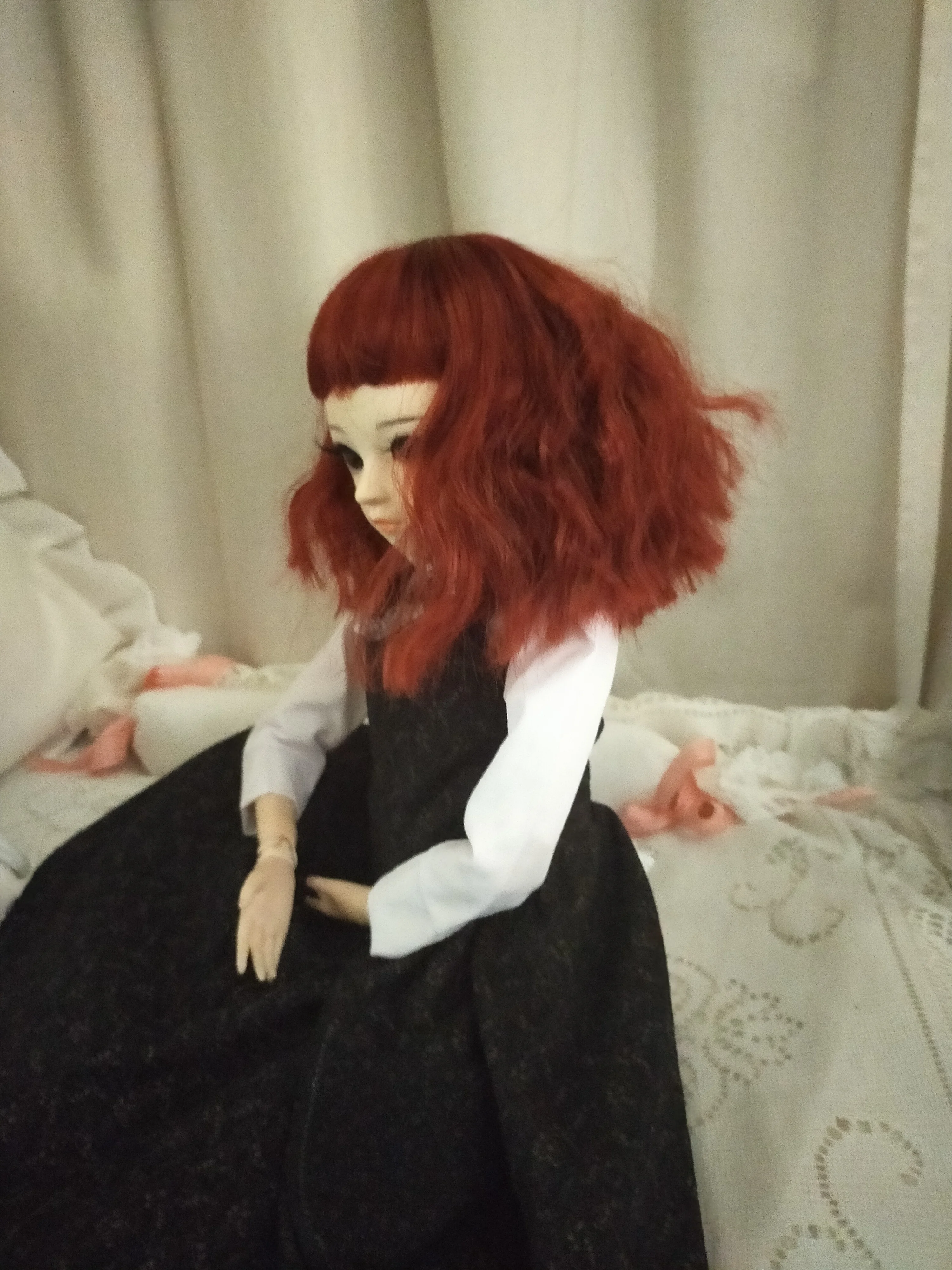 Парик пошит неаккуратно, по всей окружности торчит ткань от шапочки, ее не видно только если голова куклы наклонена вниз. Сама шапочка очень глубокая, на лбу сползает на глаза, запросто можно натянуть на уши, практически до шеи. Волосы практически прямые. Но, доставка быстрая, дошло до СПБ за 2 недели. Упаковано просто в пакет.