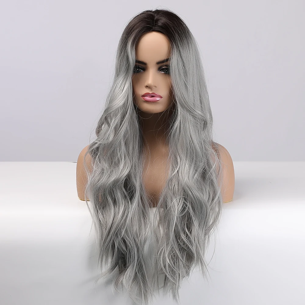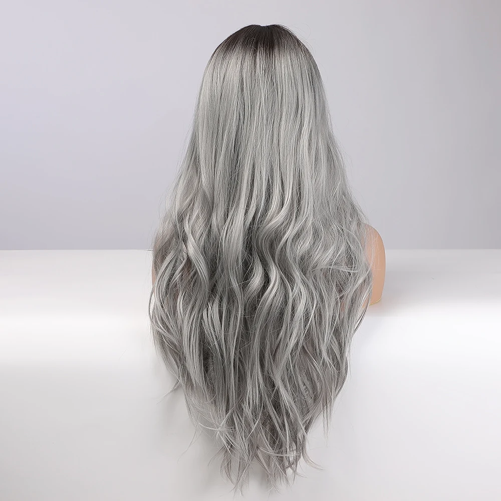 Long Wavy Silver Gray Ash Wigs with Highlights