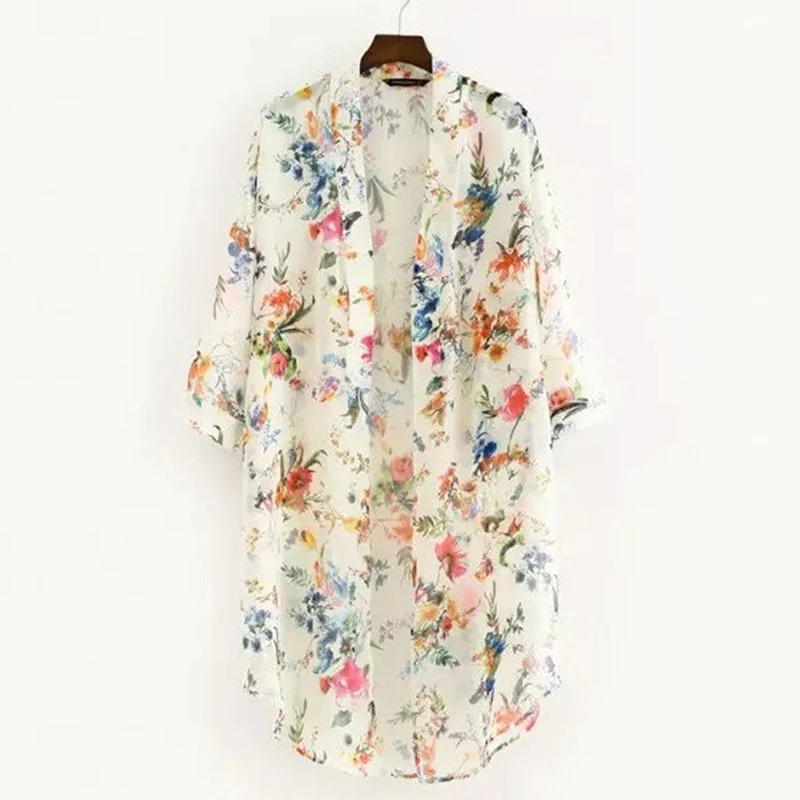 Женская винтажная Цветочные шифоновые блузки свободная шаль кимоно кардиган бохо Топы Длинные солнцезащитные куртки блузка