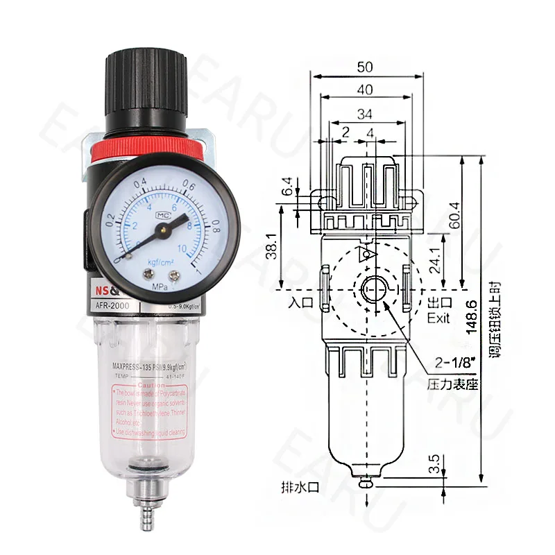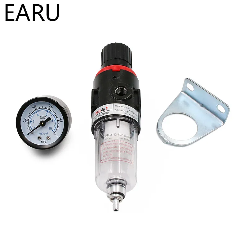1 шт., AFR-2000, пневматический фильтр, блок обработки воздуха, регулятор давления, компрессор, редукционный клапан, разделение масла, воды, датчик AFR2000, 1/4 дюйма, воздушный фильтр, компрессор, поставляется с манометром и монтажным кронштейном, резьба трубы: G 1/4 дюйма, номинальный поток: 2000L/мин прочный Давление: 1,5 МПа жидкости Температура: 5 - 60 градусов Цельсия Макс. Нажмите: 0,99 МПа Диапазон давления: 0,05-0,85 МПа