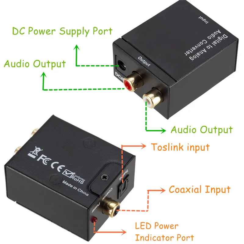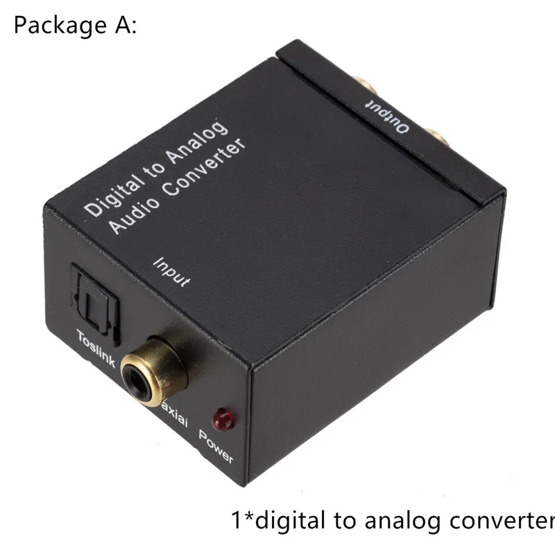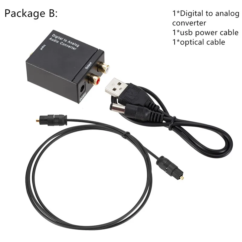 Посылка A:Спецификация:Входное аудио: коаксиальный или Toslink цифровой аудиоВыход Аудио: аналоговый L/R аудиоВход аудио разъем Toslink, 1XRCA (коаксиальный)Выход аудио разъем: 2XRCA, оборот в минуту (R/L)Частота дискретизации: 32, 44,1, 48 и 96 кГцРабочая температура: 0 ~ 70 °CРабочая влажность: 10% ~ 85% относительной влажности (без конденсации)Внешний источник питания: 5 В постоянного тока/1 АМощность Потребляемая мощность: 0,5 W Посылка включает:1 х цифровой в аналоговый аудио конвертер адаптерПосылка B:Спецификация:Входное аудио: коаксиальный o r Toslink цифровой аудиоВыход Аудио: аналоговый L/R стерео аудиоВходной аудиоразъем: Toslink, 1x RCA (коаксиальный)Выходной аудиоразъем: 2x RCA (R/L)Частота дискретизации: 32, 44,1, 48 и 96 кГцМатериал: металлРазмер изделия: около 64*40*25 ммПосылка:1 х цифровой аудио конвертер1 х USB кабель1 х Волоконно-оптический кабель (0,5 м)Руководство пользователя на английском языке-1 шт.