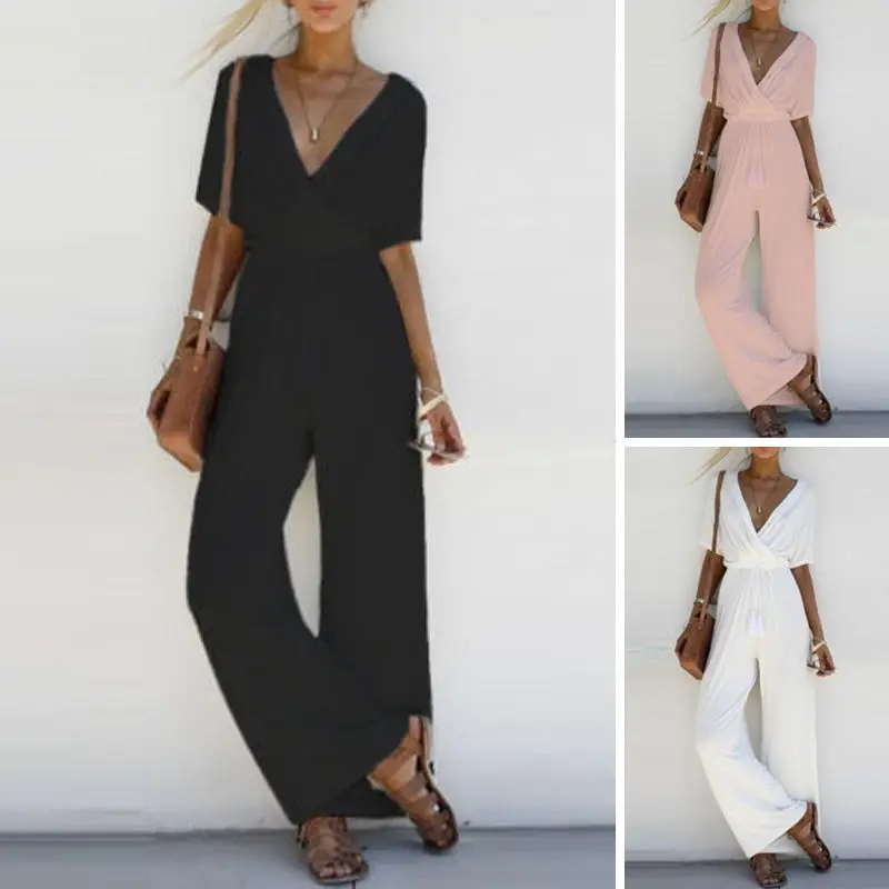 Комбинезон женский с коротким рукавом, повседневный ромпер с V-образным вырезом, с широкими штанинами, свободный белый черный розовый однотонный трикотажный Ромпер