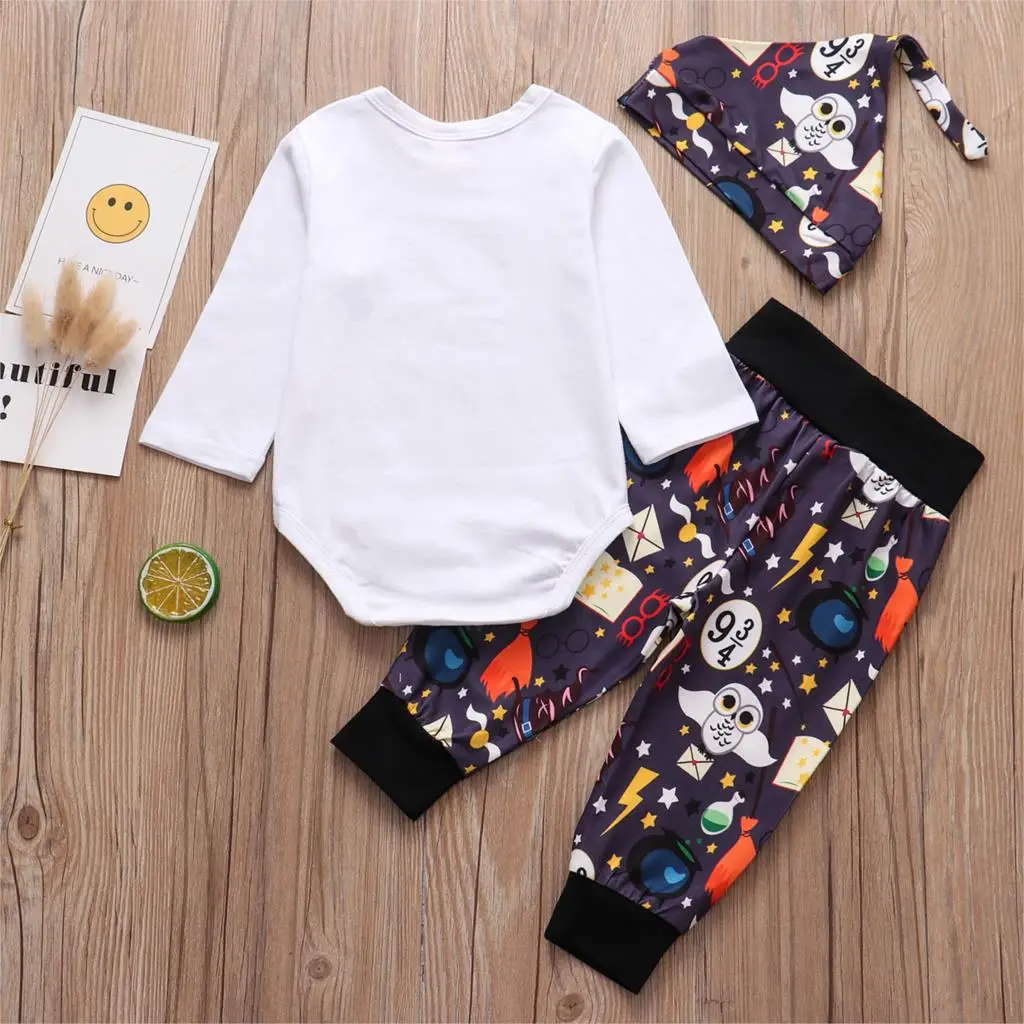 Комплект одежды из 3 предметов для новорожденных и малышей, коллекция 2020 года, костюмы для костюмированной вечеринки на Хэллоуин костюм маленького волшебника, комбинезон + штаны + шапочка, одежда для маленьких мальчиков