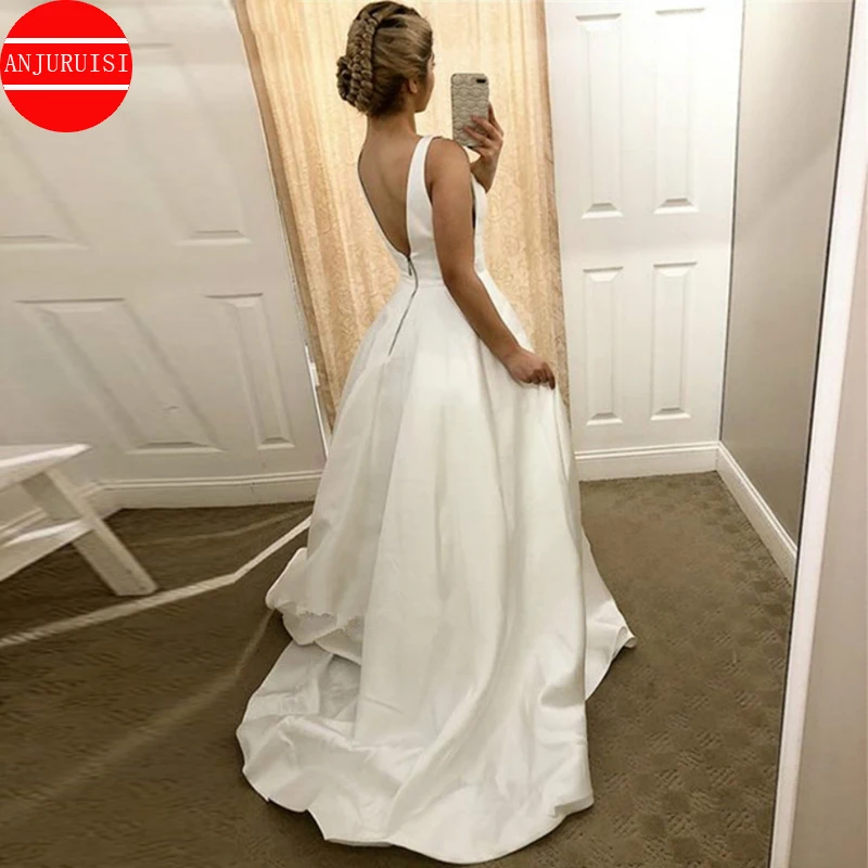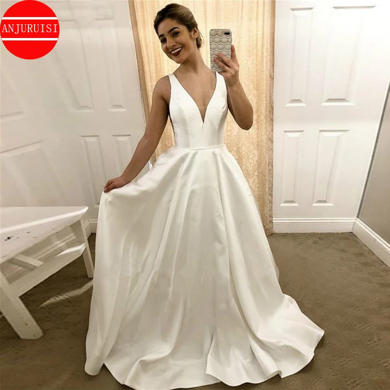 Женское свадебное платье без рукавов, Белое Атласное Платье с v-обр...