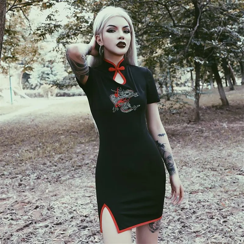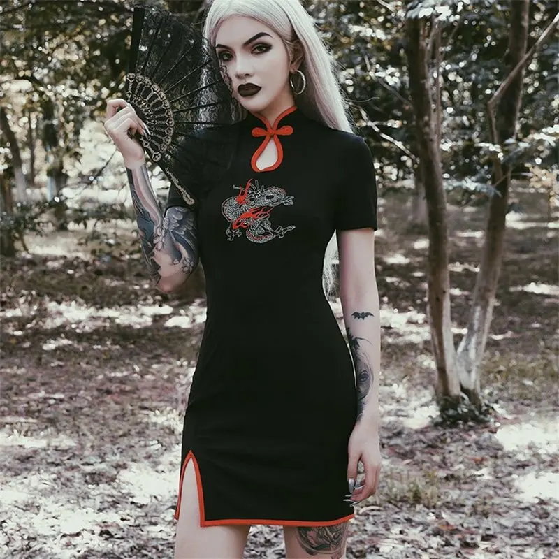 Женское винтажное платье с вышивкой, готическое платье в японском стиле с драконом и разрезом на воротнике, уличная одежда хаори с коротким рукавом для вечеринки в стиле Харадзюку
