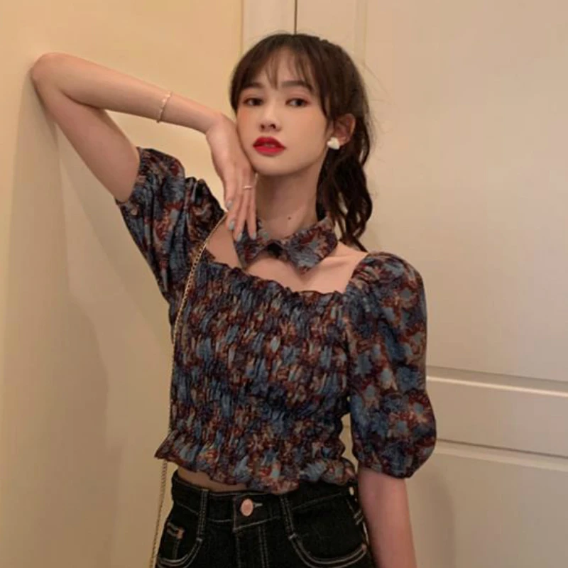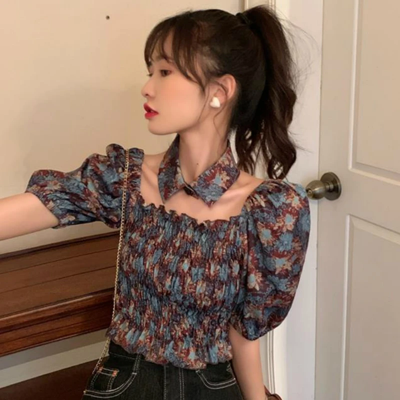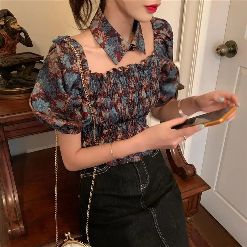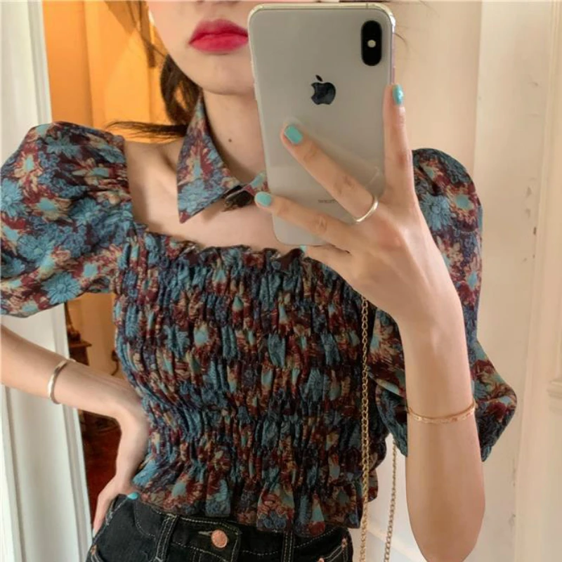 Блузка женская с квадратным вырезом и цветочным рисунком