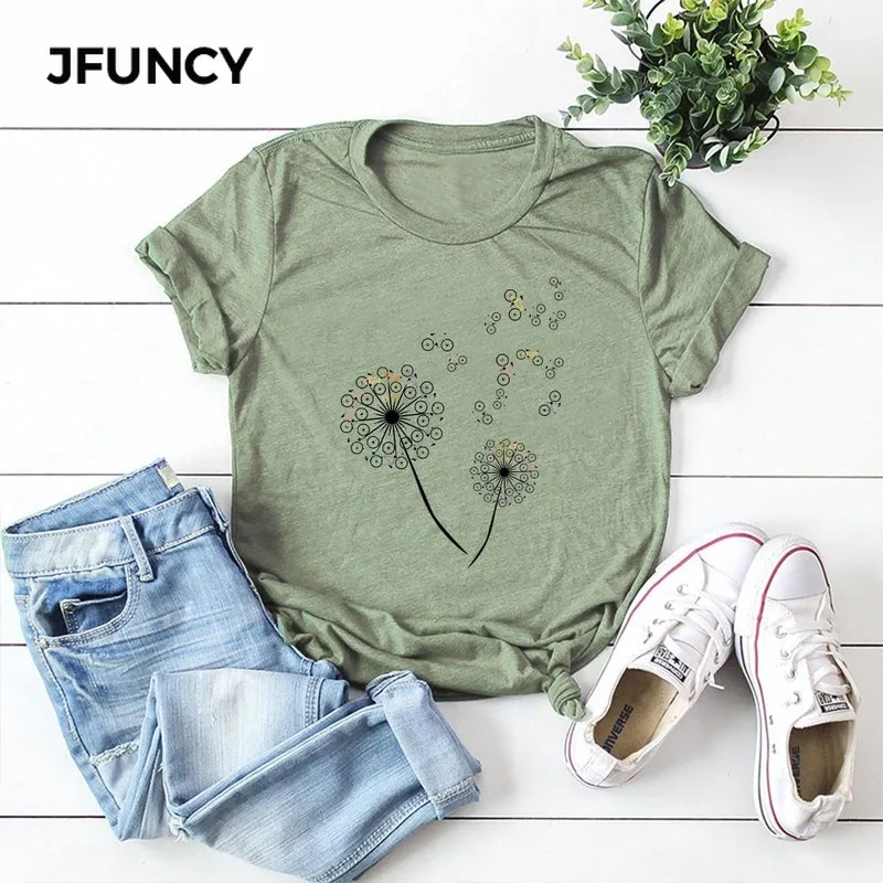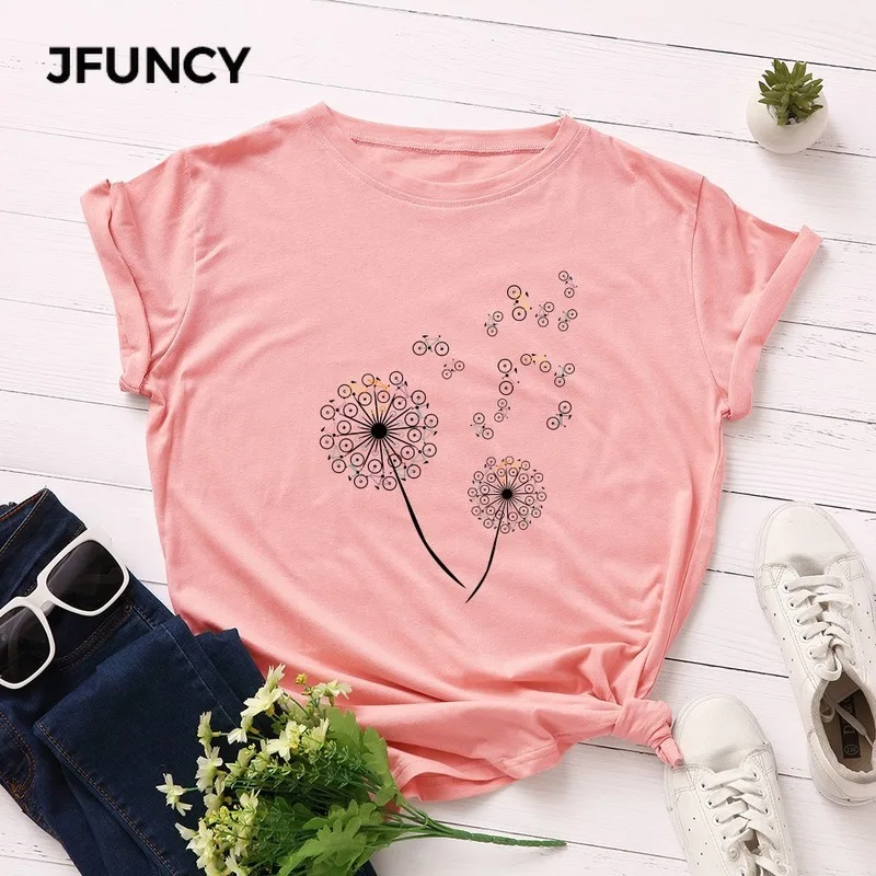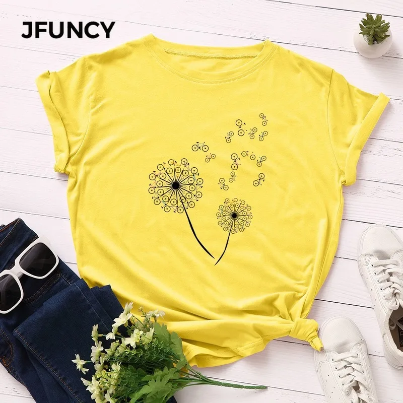 JFUNCY Новая женская хлопковая футболка размера плюс, летняя женская рубашка с коротким рукавом, креативная женская футболка с изображением велосипеда одуванчика Harajuku