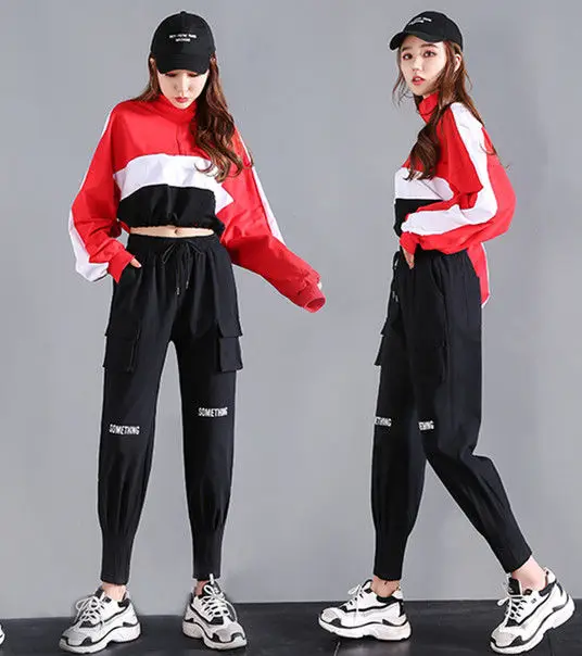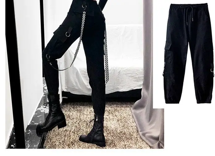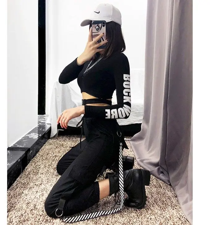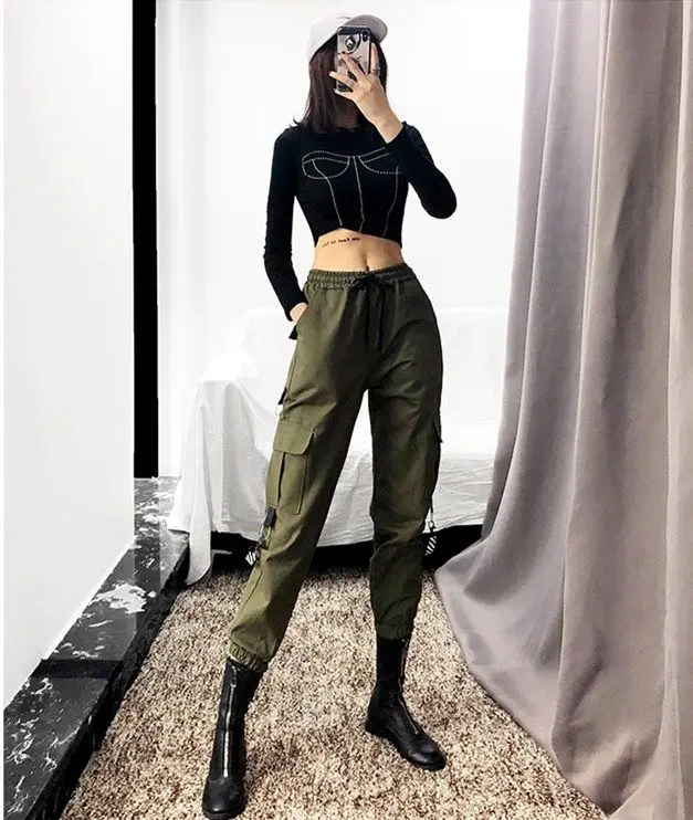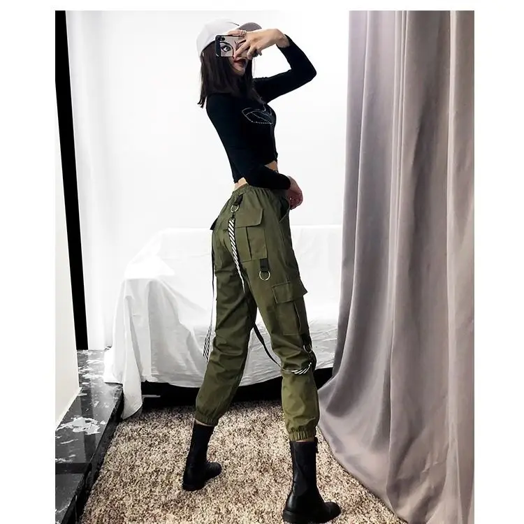 Брюки-карго женские черные повседневные с высокой талией свободные в стиле хип-хоп