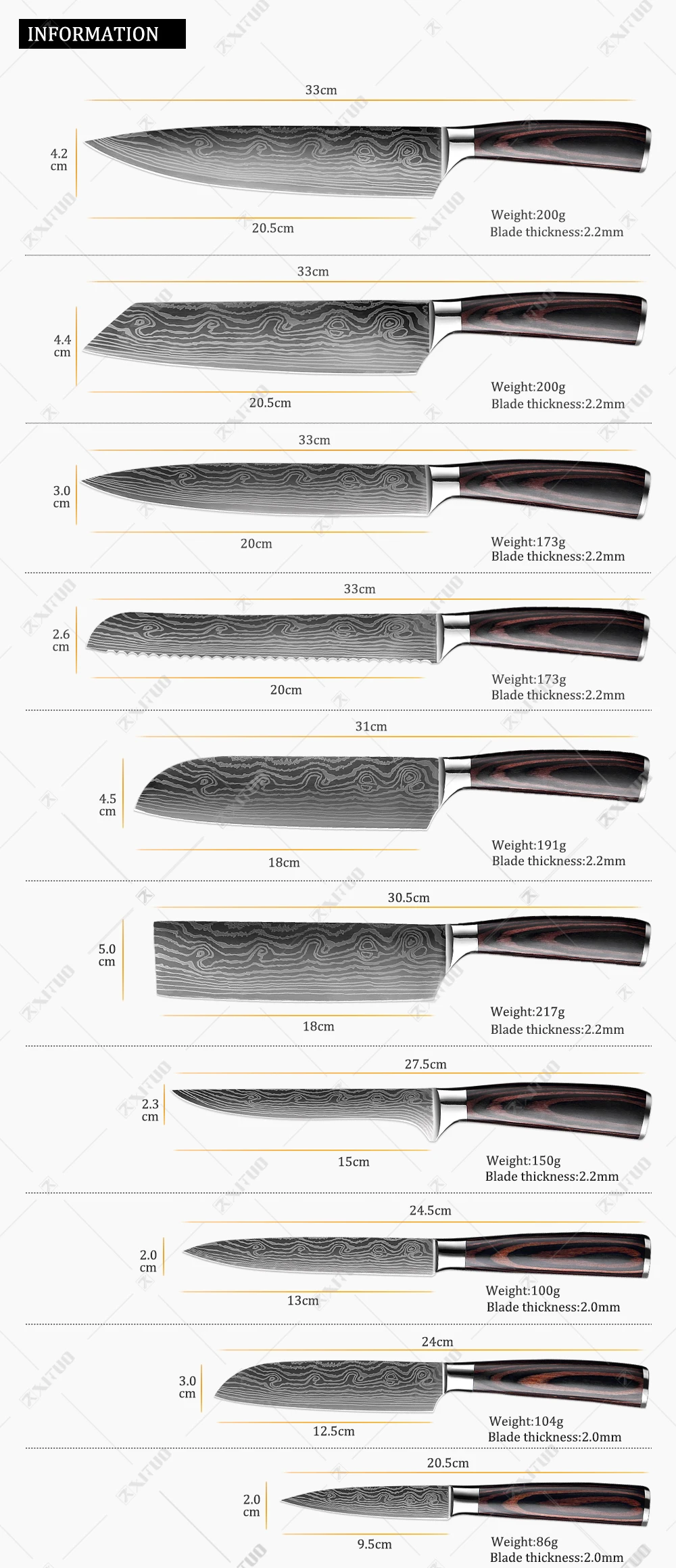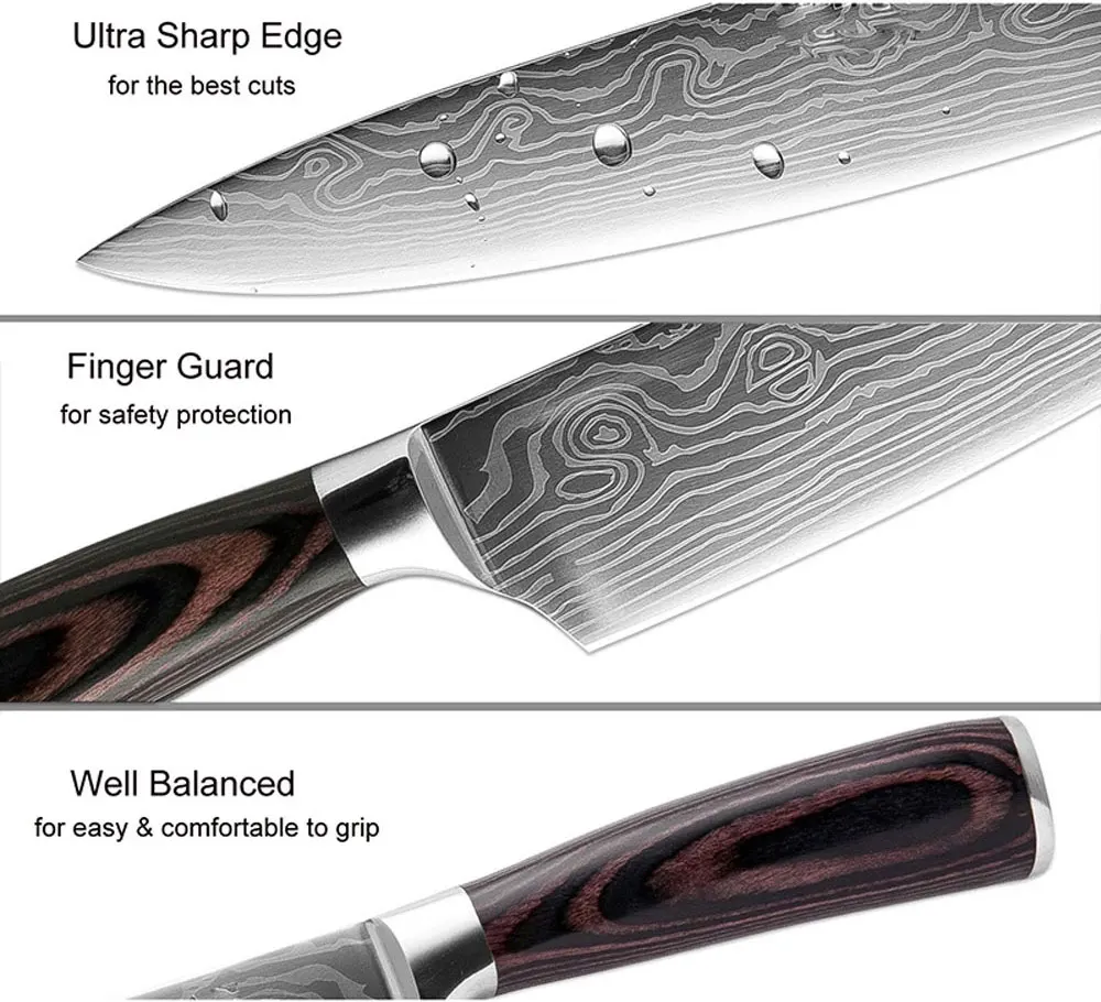 Советы: лезвие из нержавеющей стали 7CR17, поверхность лазерного Дамасского узора, очень красивая, хорошее качество изготовления, бритва, держите свою кухню вдали от тупого ножа и наслаждайтесь жизнью на кухне!
