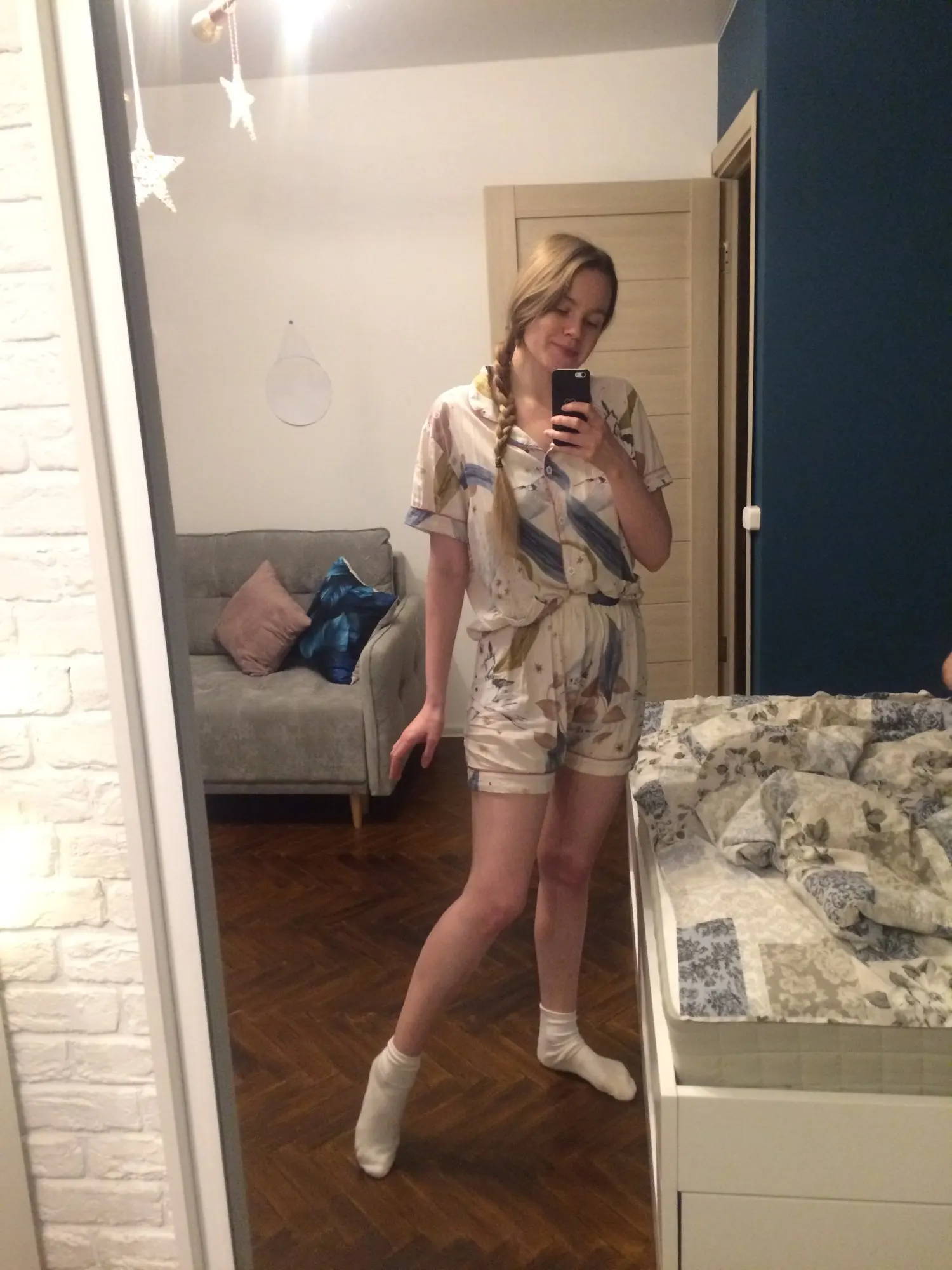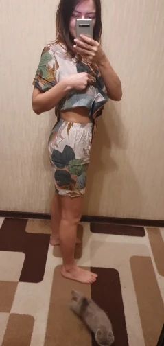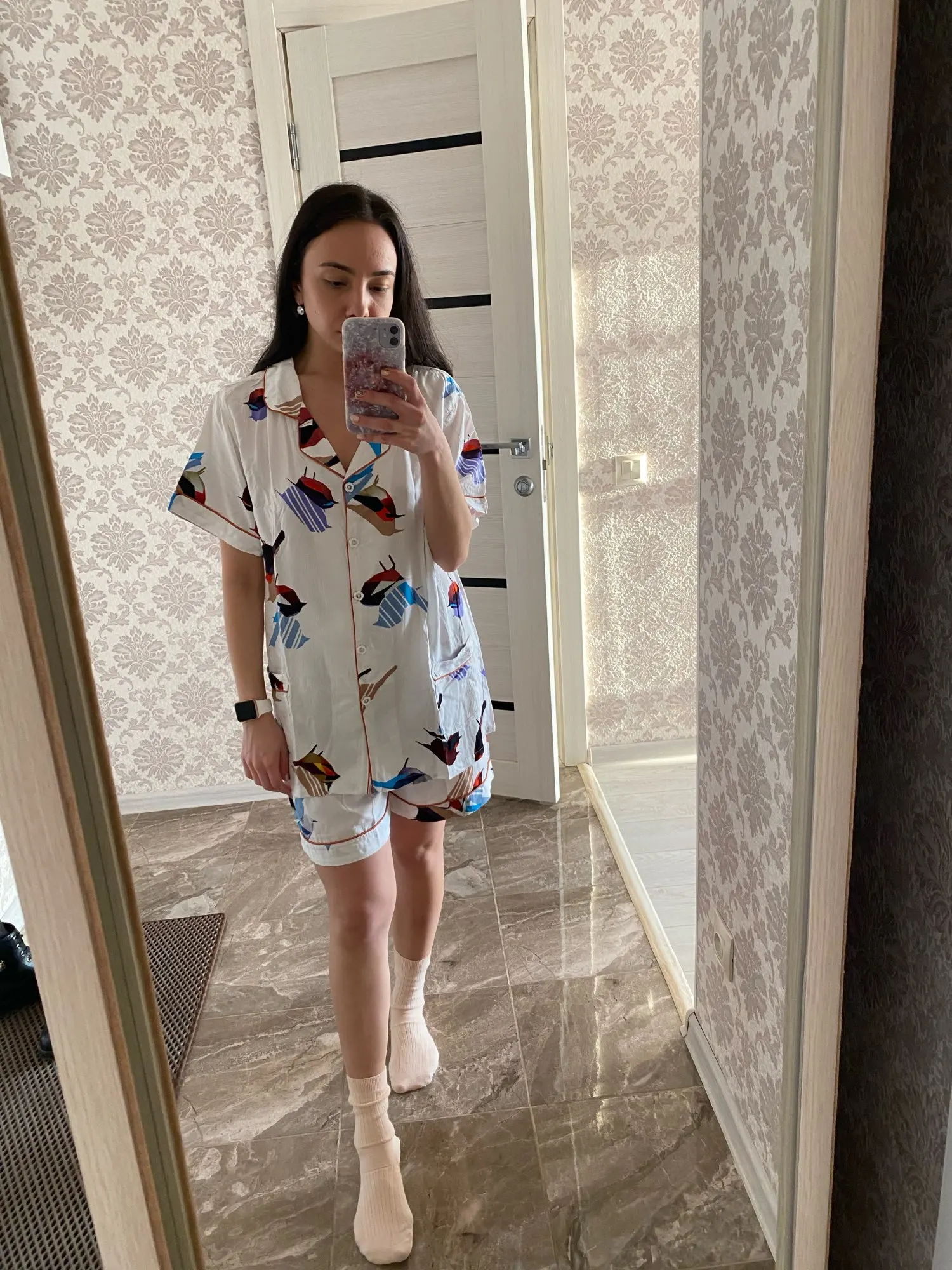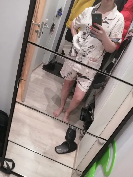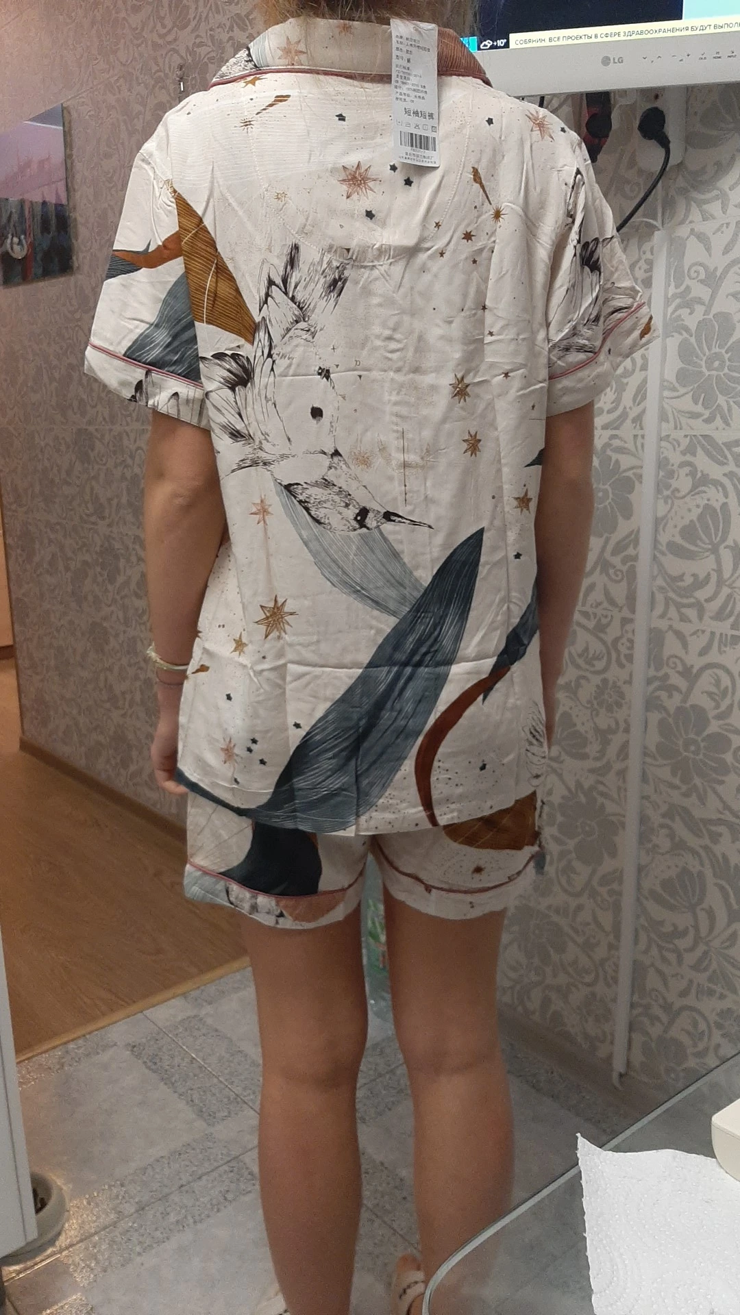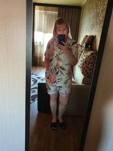 Супер пижама. Мой вес 50 кг, заказала размер L, очень свободно. Наверное, можно было и M. Ткань пижамы очень приятная к телу. У меня уже есть такая же с длинным рукавом и штанишками. Теперь получился комплект из 4-предметов. Для талии 70 см поясок у шорт тянет, я люблю, когда свободно. Думаю, сама перешью его, чтобы шортики «болтались». Немного торчащих ниточек, не принципиально для меня.