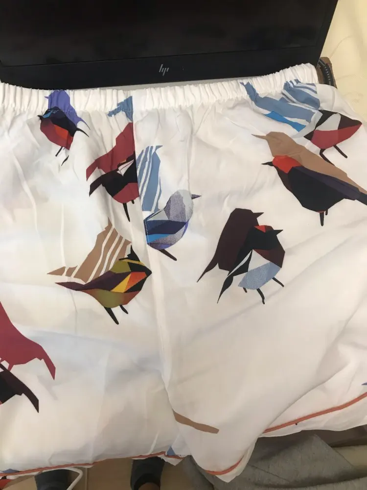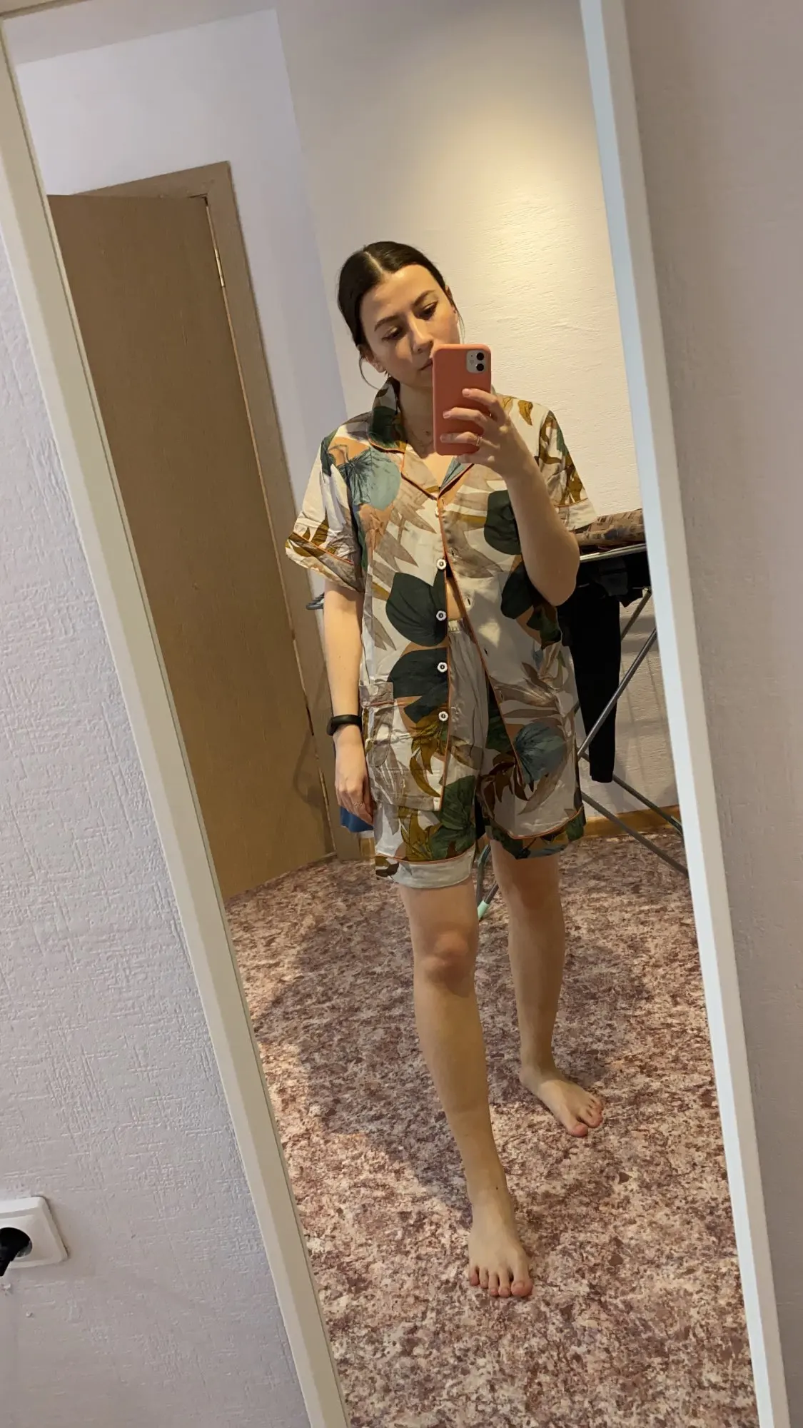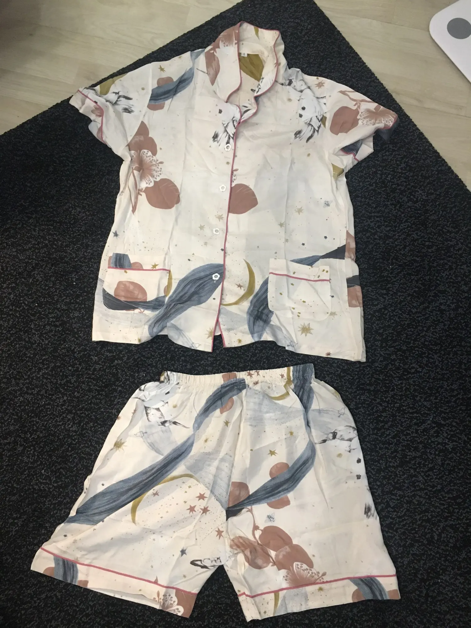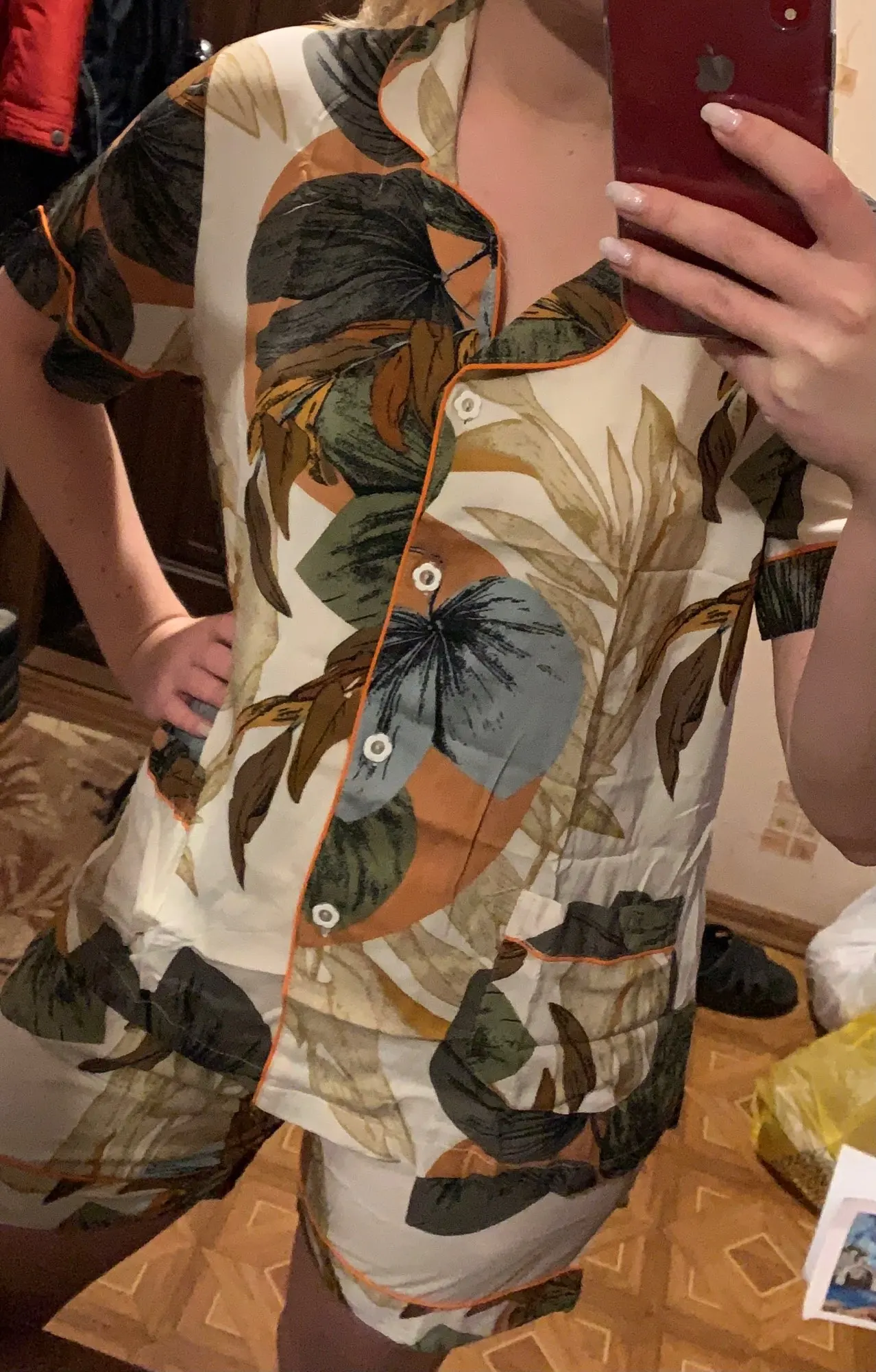 Супер пижама. Мой вес 50 кг, заказала размер L, очень свободно. Наверное, можно было и M. Ткань пижамы очень приятная к телу. У меня уже есть такая же с длинным рукавом и штанишками. Теперь получился комплект из 4-предметов. Для талии 70 см поясок у шорт тянет, я люблю, когда свободно. Думаю, сама перешью его, чтобы шортики «болтались». Немного торчащих ниточек, не принципиально для меня.