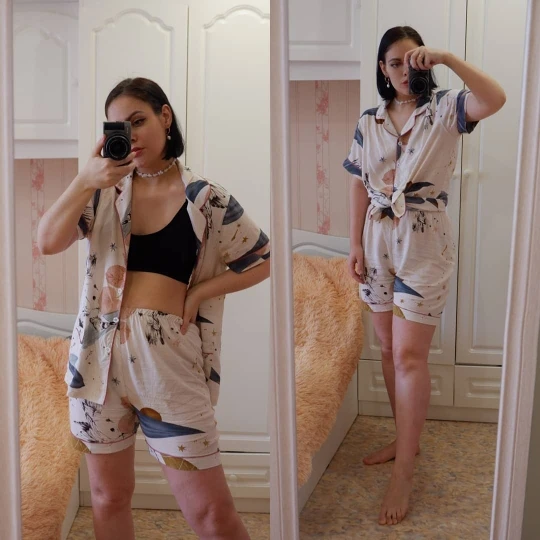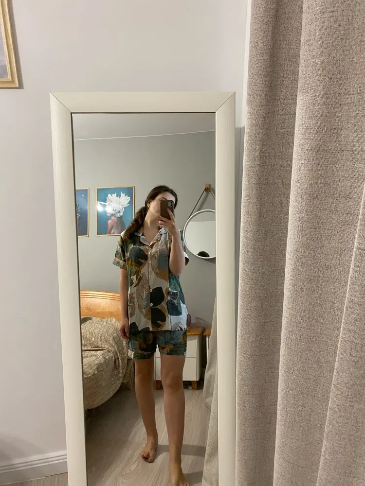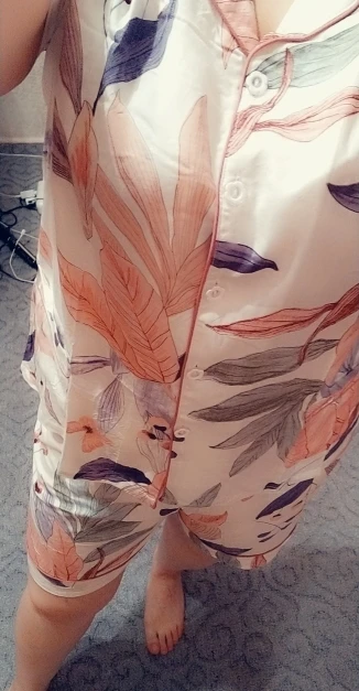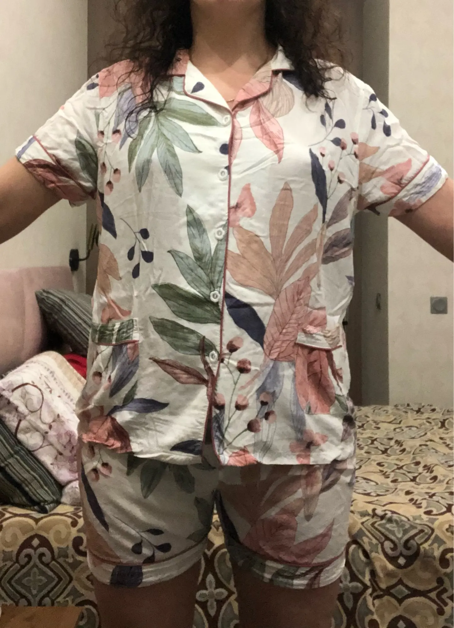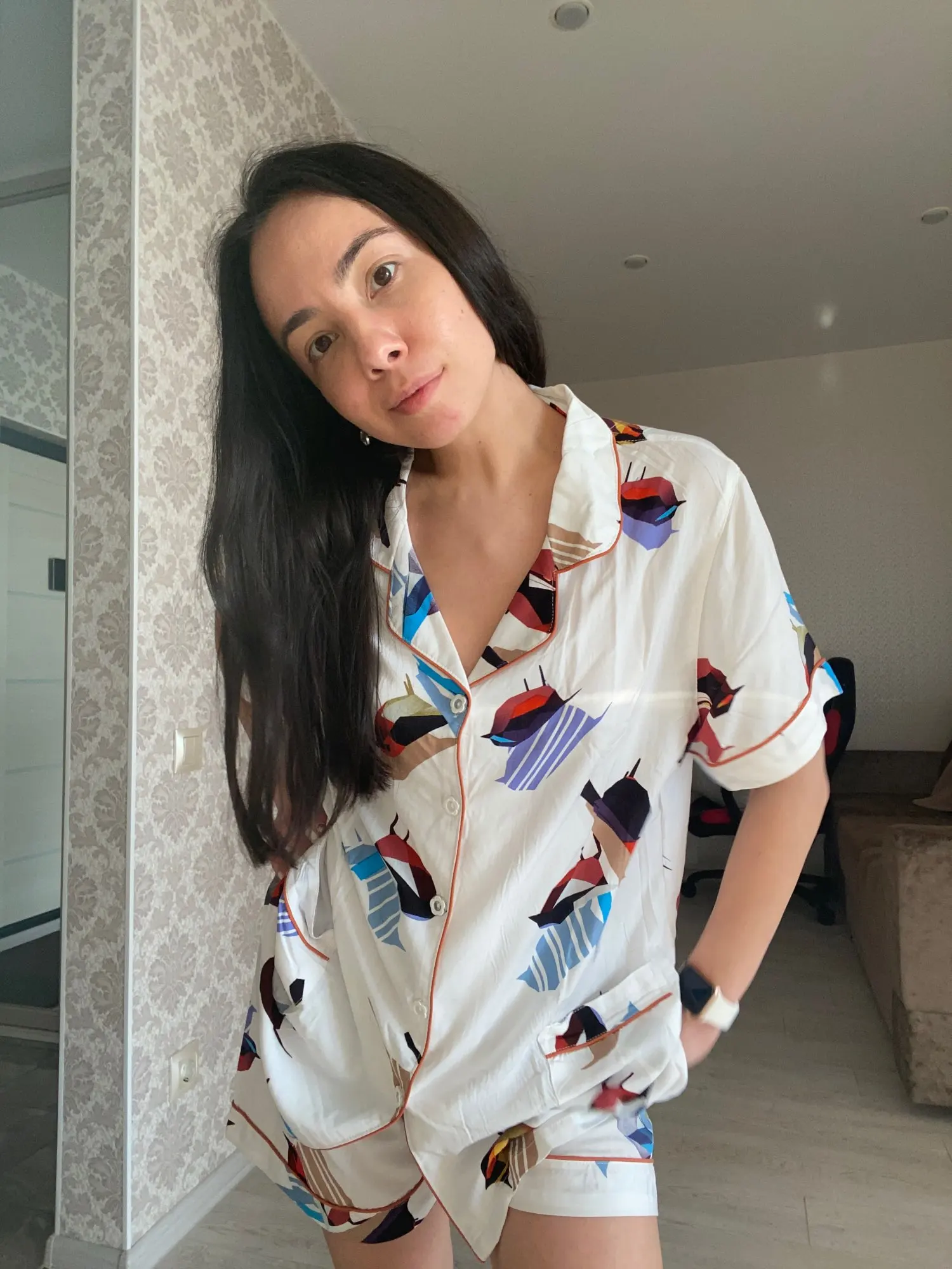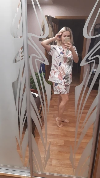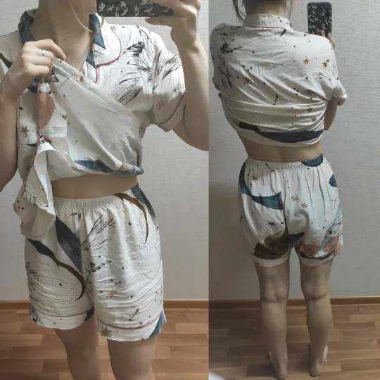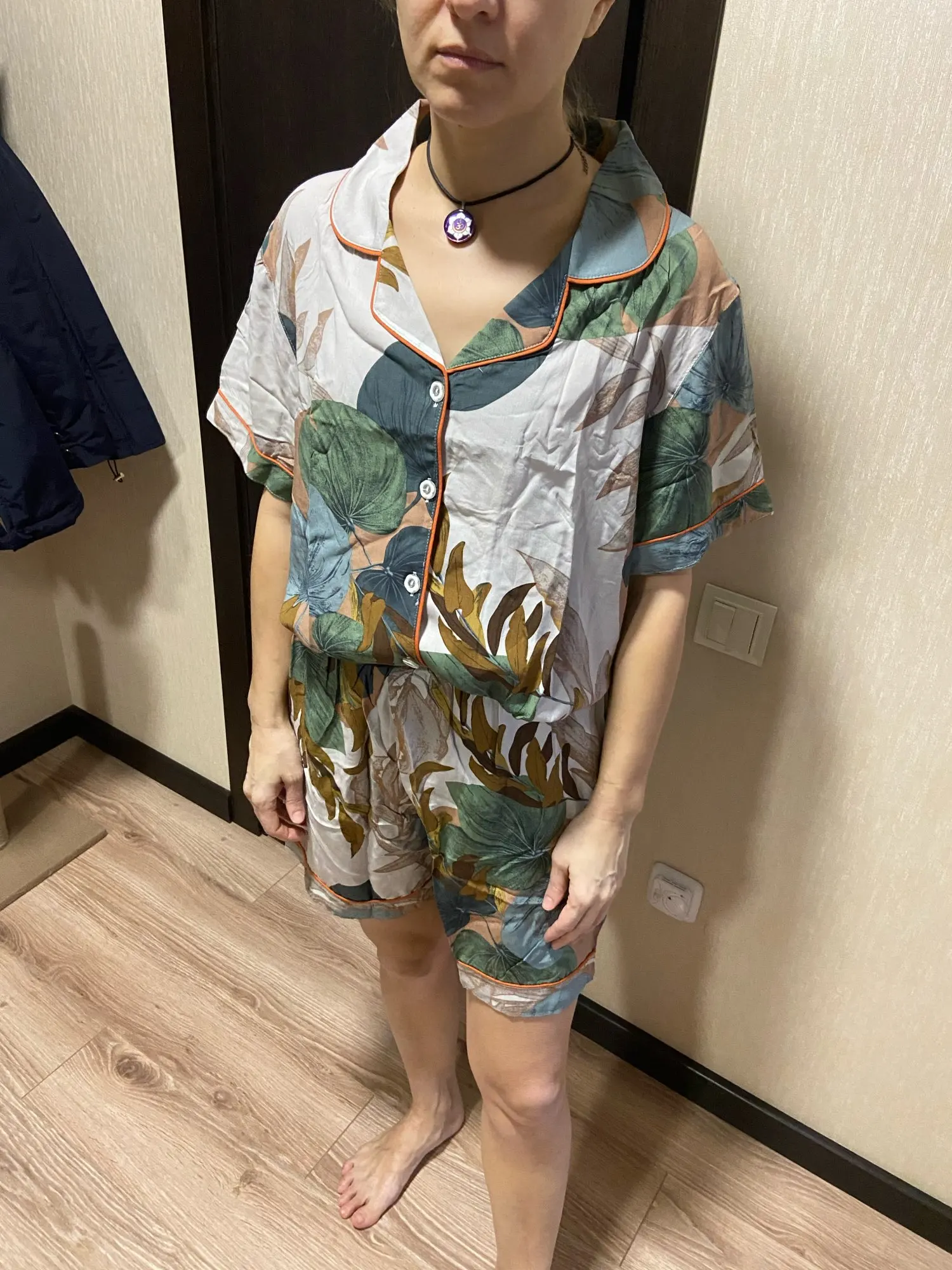 Хорошая пижама, приятная ткань, это моя вторая покупка уже, первая была со штанами и длинным рукавом. Здесь шорты узковаты, если ноги не супер стройные, но это не проблема. В целом рекомендую