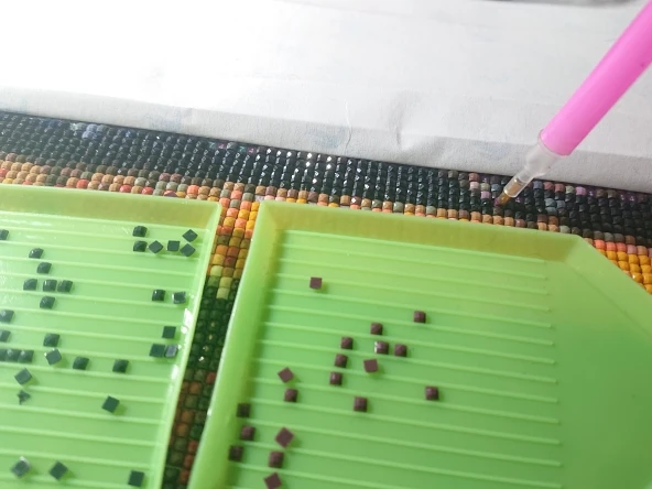 1. См. Таблицу сравнения на холсте, чтобы определить каждый номер алмаза и соответствующий номер печати на холсте. 2. Вставьте круглый конец ручки в Дозирующий цемент (нажмите, чтобы сохранить цемент на месте). 3. Используйте круглый конец ручки, чтобы приклеить бриллиант и слегка нажмите, чтобы удалить любой дополнительный цемент. 4. Разорвите частичную пленку и поместите алмаз на холст в соответствии с соответствующим номером. 5. Если вы приклеите алмаз к неправильной области на картине, удалите алмаз пинцетом. 6. После завершения слегка прижмите алмазы рукой или книгой, чтобы убедиться, что алмазы надежно закреплены.