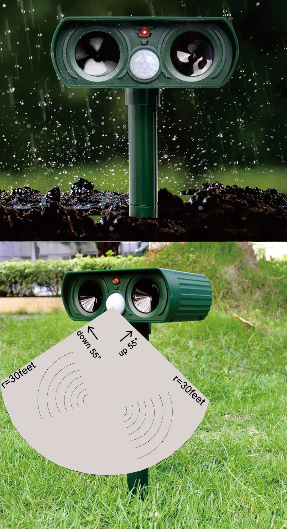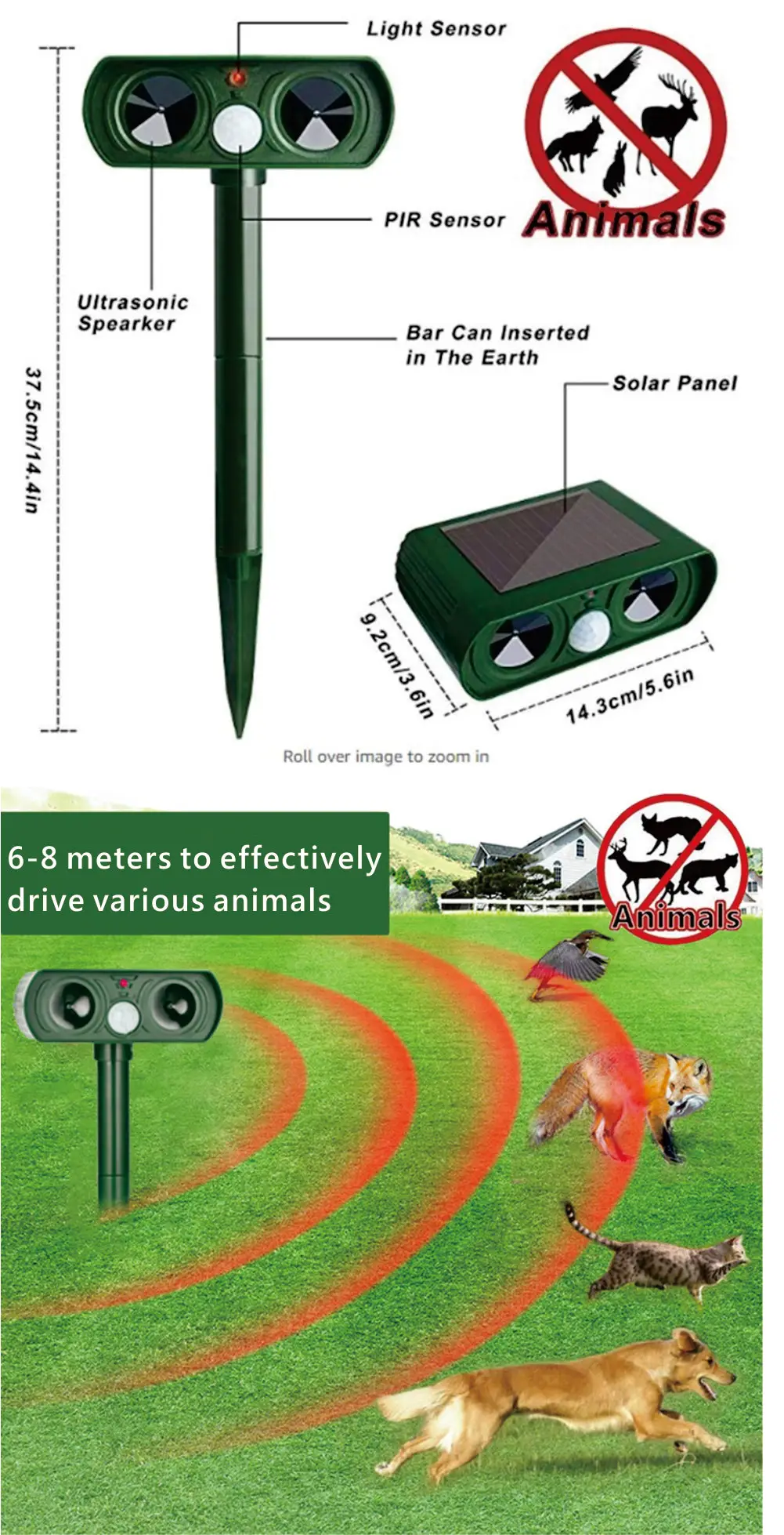 Технические данные:1. Сильный ультразвуковой сигнал пугает животное. Запугать животное в области неприятного ультразвукового звука животного. Звук включается, когда животное входит в диапазон. Поэтому животное не может привыкнуть к звуку, а отталкивающая сила сильнее.Кнопка «SENS» (слева): регулировка чувствительности и расстояния. Поворачивая ручку по часовой стрелке, вы увеличиваете объем защиты. Отсоедините маленькое животное и поверните ручку вправо.Расположение кнопки «частота»:Источник питания: солнечная панель и 3 × АА батареяЭффективное расстояние: до 8 м (в зависимости от погоды и окружающей среды)Угол обнаружения: 110 ° по горизонтали (в зависимости от погоды)Водонепроницаемость: IPX4. Не помещайте в водуСертификат: CE & ROHS, FCCОн использует принцип инфракрасного обнаружения и посылает ультразвуковые волны, чтобы отгонять маленьких животных при обнаружении маленьких животных. Это поможет вам держаться подальше от притеснений маленьких животных, таких как неприятные бродячие собаки и бродячие кошки, тем самым защищая вашу собственность, ваш сад и ваш внутренний двор.Потому что это портативный дизайн продукта, он может быть установлен в любом месте вашего дома, сада или двора. Этот продукт может быть использован с низковольтным источником питания и батареей. Этот продукт только водит животных без каких-либо химических веществ. Он излучает только 25 кГц. Ультразвуковая частота вытеснила их. Никакого вреда для человеческого тела1) громкоговоритель: этот продукт может излучать высокую частоту для выезда животных.2) детектор движения PIR: это инфракрасный датчик, который непрерывно выводит сигналы. Когда обнаружится, что движущееся животное находится в пределах диапазона обнаружения, оно автоматически излучает частоту звуковой волны, чтобы управлять животным, а светодиодный индикатор также включит светильник.3) светодиодный индикатор