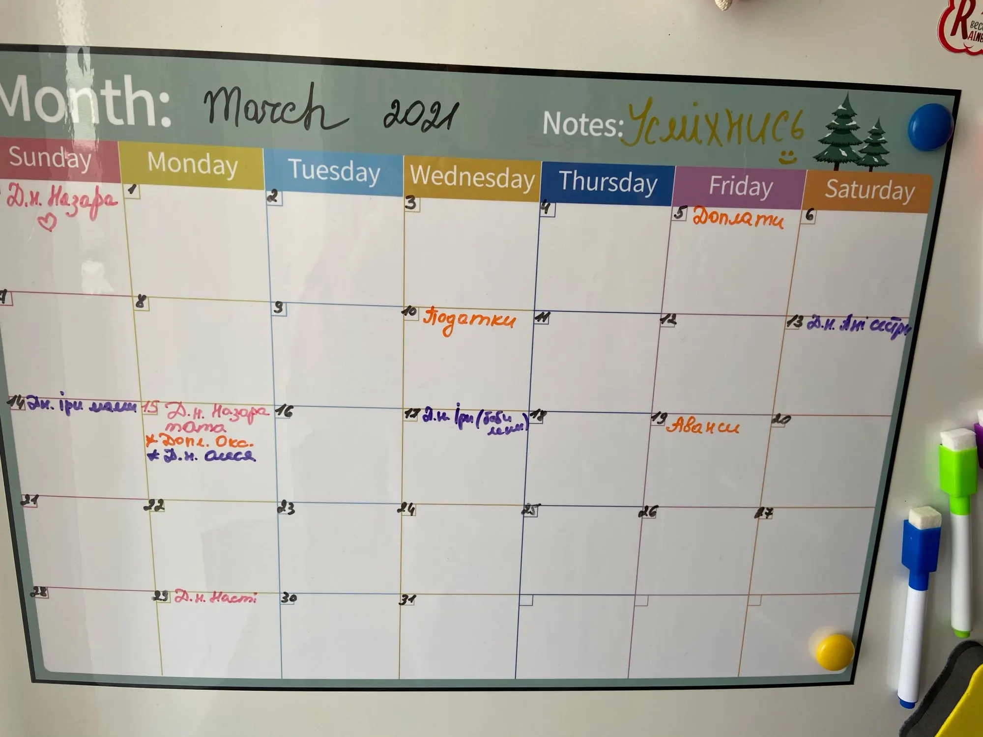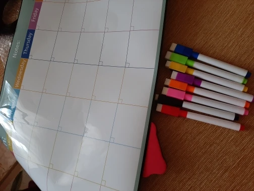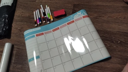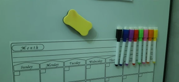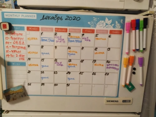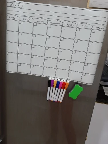 супер крутой календарь, теперь ничего не забуду, все фломастеры пишут, губка чистит без следа, все держится, не падает, очень удобно. Жаль только у меня холодильник округлый, края календаря немного отстают, был бы прямой, тогда бы все вообще было бы идеально