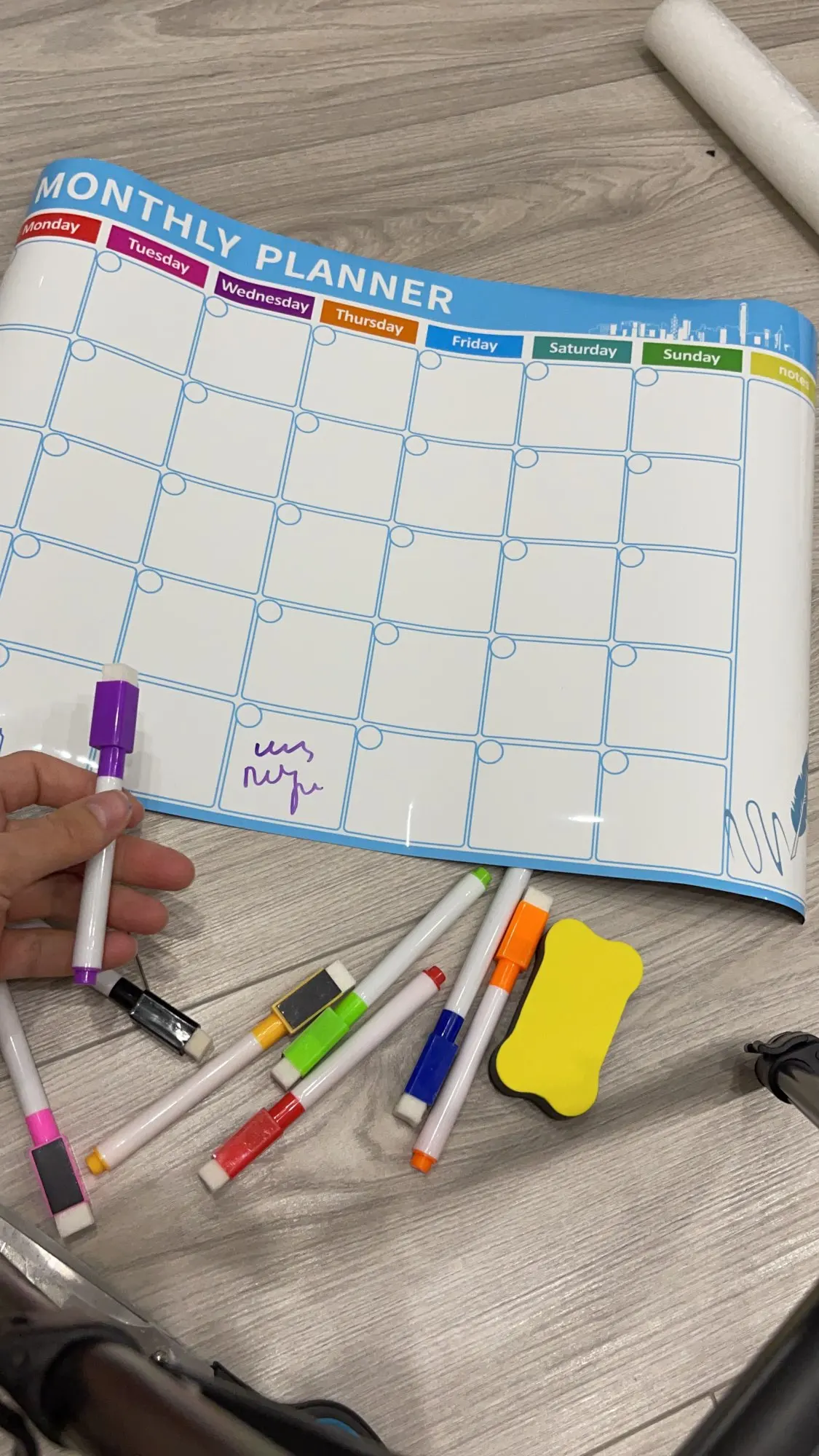 Календарь отправили быстро. Пришел в скрученном состоянии, не мятый и целый, хорошо упакован. Все фломастеры в пупырчатом пакете. Календарь полежал несколько часов под книгами и стал ровным. Без предварительного разгибания на холодильник можно не вешать - края сильно загибаются. К холодильнику календарь хорошо прилип, убрать его тоже не сложно. Магнит в меру сильный. Все фломастеры пишут. В целом цвета понравились. Фломастеры пишут толсто. На них также есть магниты. Горизонтальное положение держут плохо, но с холодильника не падают. Губка приехала жёлтая. Держится неплохо.