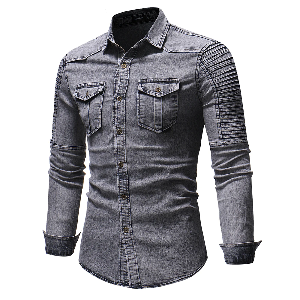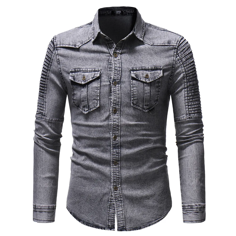 Мужская джинсовая рубашка с плиссированными рукавами и длинными рукавами, с несколькими карманами