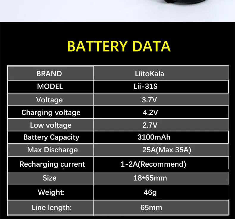 Бренд: LiitoKalaМодель: Lii-31SНапряжение: 3,7 VЕмкость: 3100 мАчСопротивление:Ток разряда: 25а (макс. 35А)Время циклов: 800 раз