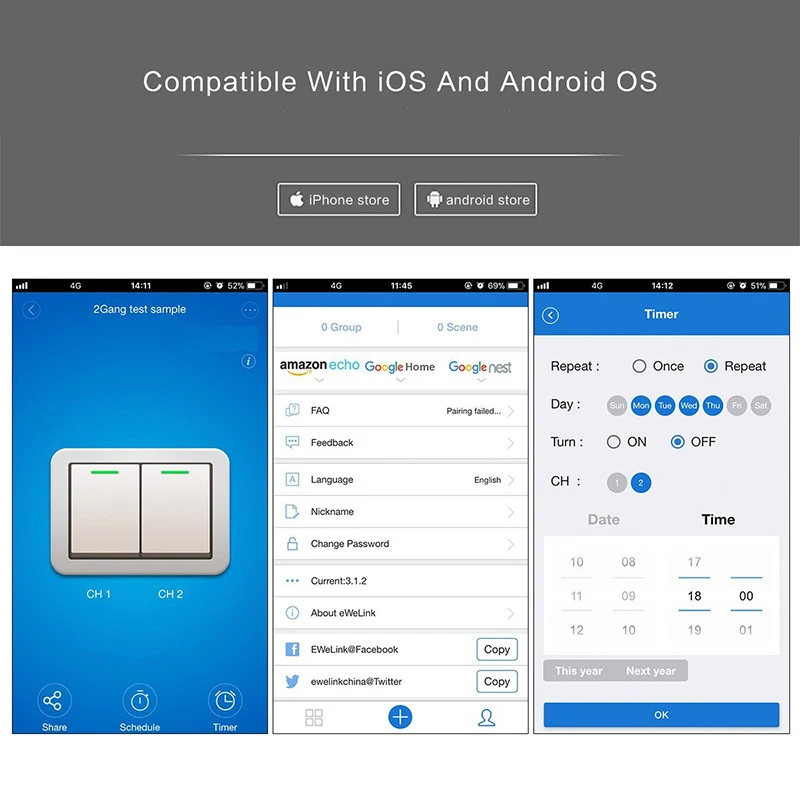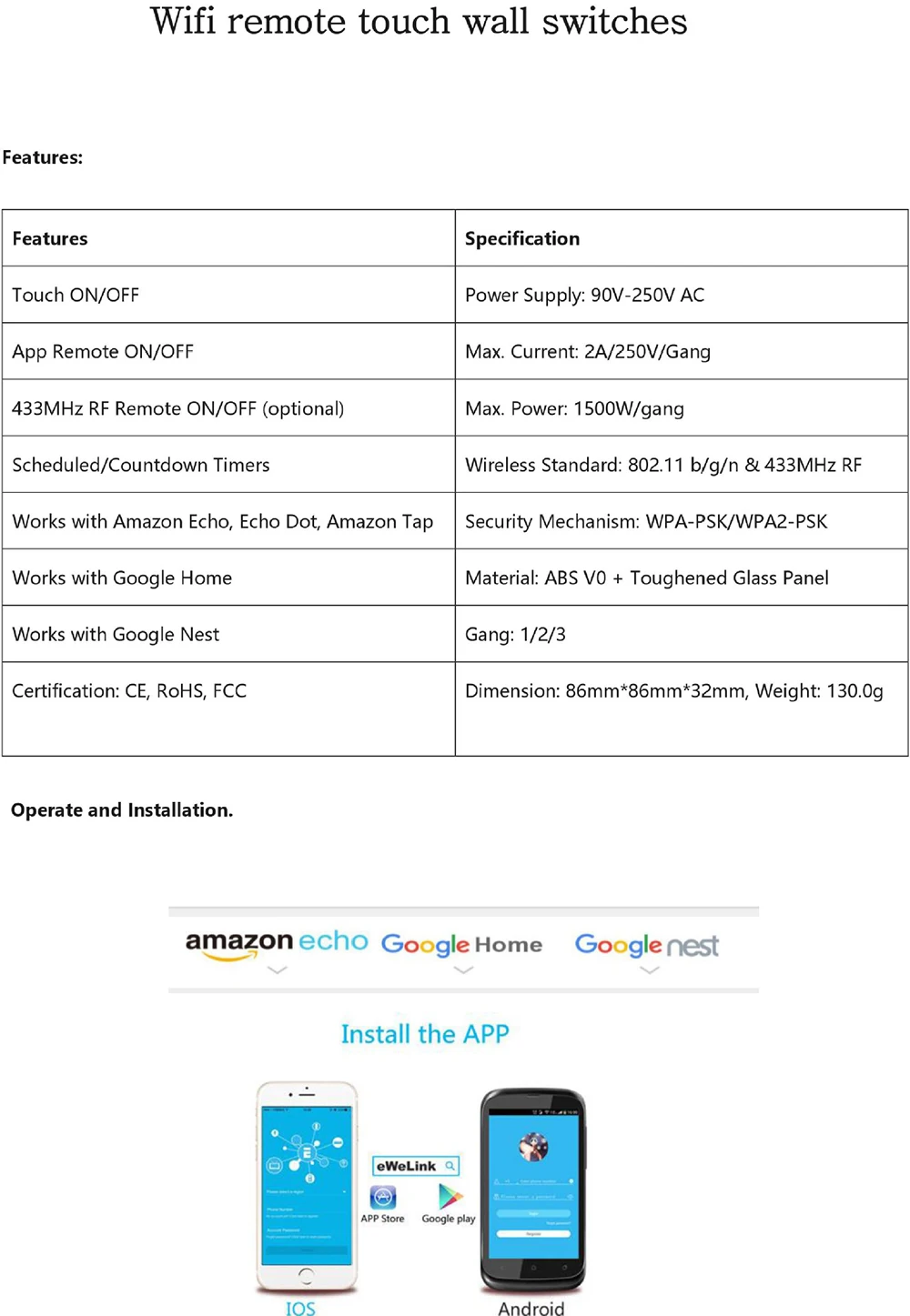 Продукт: Размер изделия: 86*86*33,5 мм Метод управления: сенсорный, голосовое управление, мобильное приложение три в одном многофункциональное управление Подходит для рынка: европейские правила/британские правила/Универсальный национальный стандарт Материал изделия: Высококачественная огневая основа из АБС-пластика, Пыленепроницаемая сенсорная панель из закаленного стекла Сертификат продукта: CE ROHS EMC/FCC Особенности: Широкий вход напряжения: 90-240 В Высокая мощность: 2200 Вт подходит для любых ламп. 1. Принимает панель из закаленного стекла и Сенсорный дизайн, продукт имеет красивый внешний вид и прост в использовании; 2. Непосредственно заменяет Механический выключатель без строительной проводки; 3. Низкое энергопотребление в режиме ожидания, энергосбережение и безопасность; Быстрая скорость отклика, без задержек; 4. Анти-молния и анти-всплеск, эффективно защищает цепь; 5. Пульт дистанционного управления Wi-Fi, без направления, без ограничения расстояния; 6. Отзывы о состоянии лампы в режиме реального времени, поддержка в режиме реального времени 7. Поддержка синхронизации устройства, функция задержки 8. Умное Голосовое управление, настоящий умный переключатель, умный дом