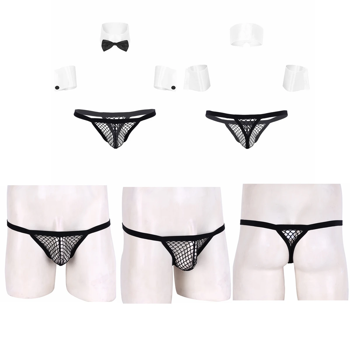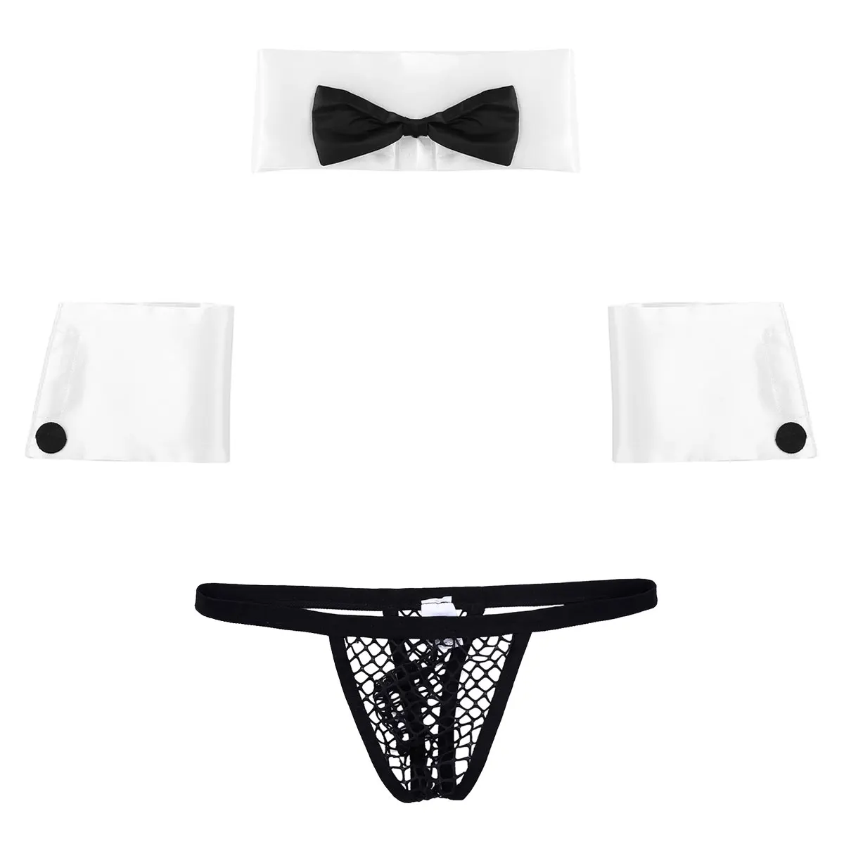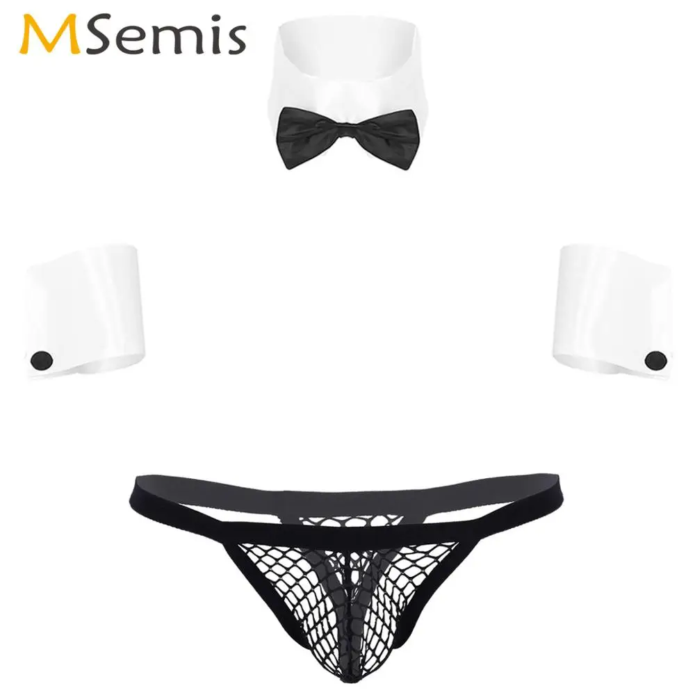 Мужской порно белье для ролевых игр горничной комплект Прозрачная сетка бикини стринги + воротник манжеты сексуальная униформа служанки эротический Косплей Костюм
