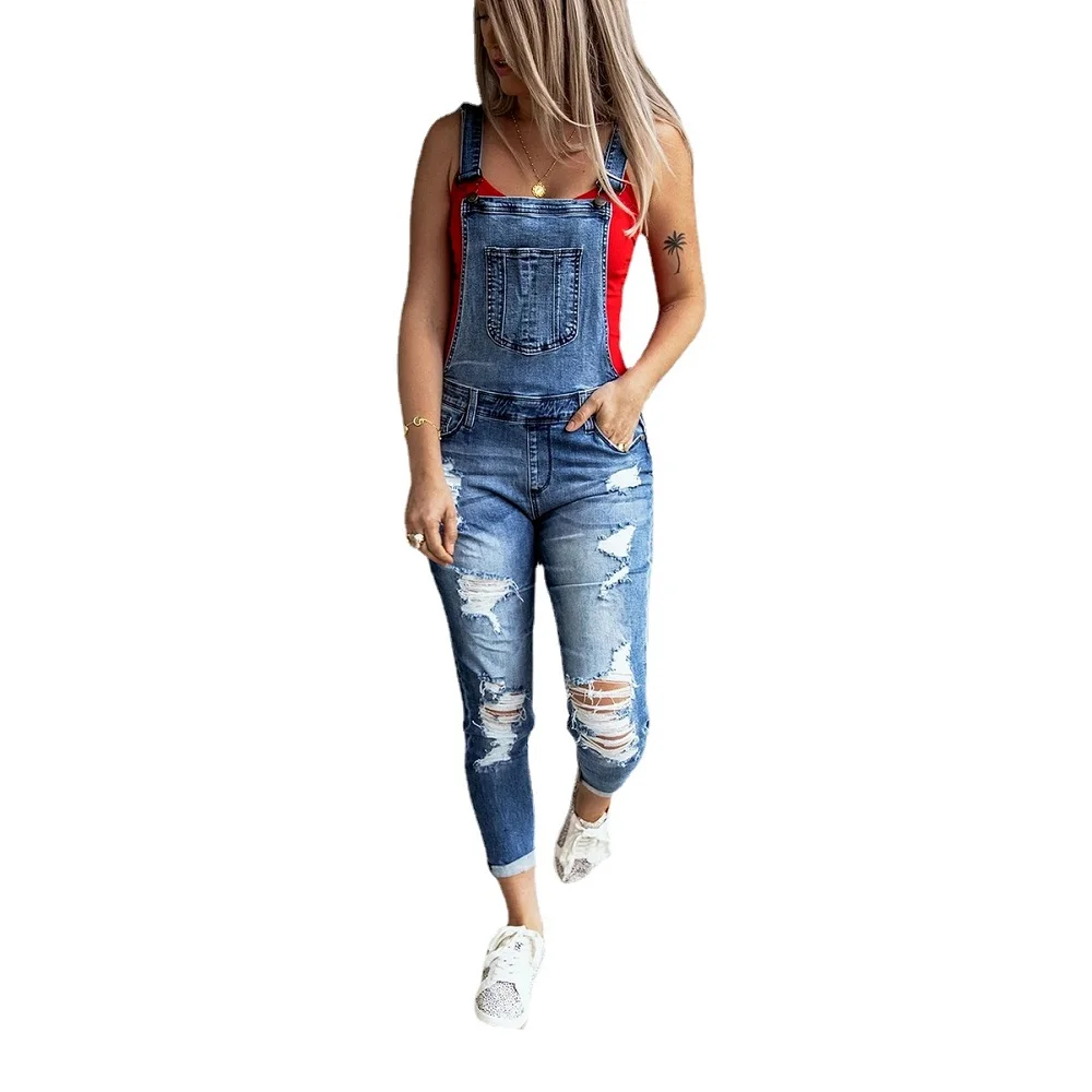 Женский джинсовый комбинезон в стиле ретро, повседневный Длинный эластичный комбинезон с карманами и рваными дырками