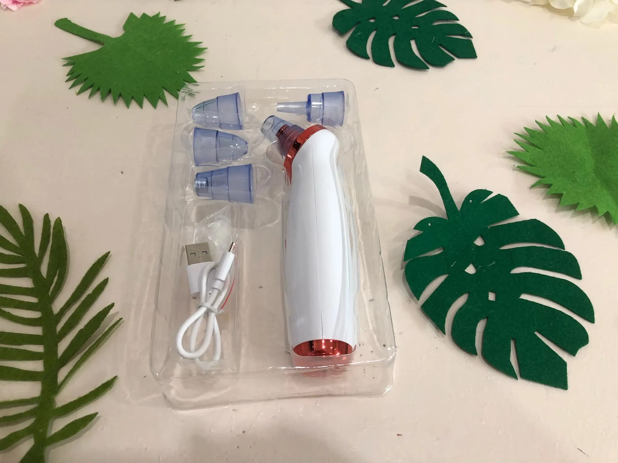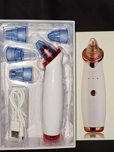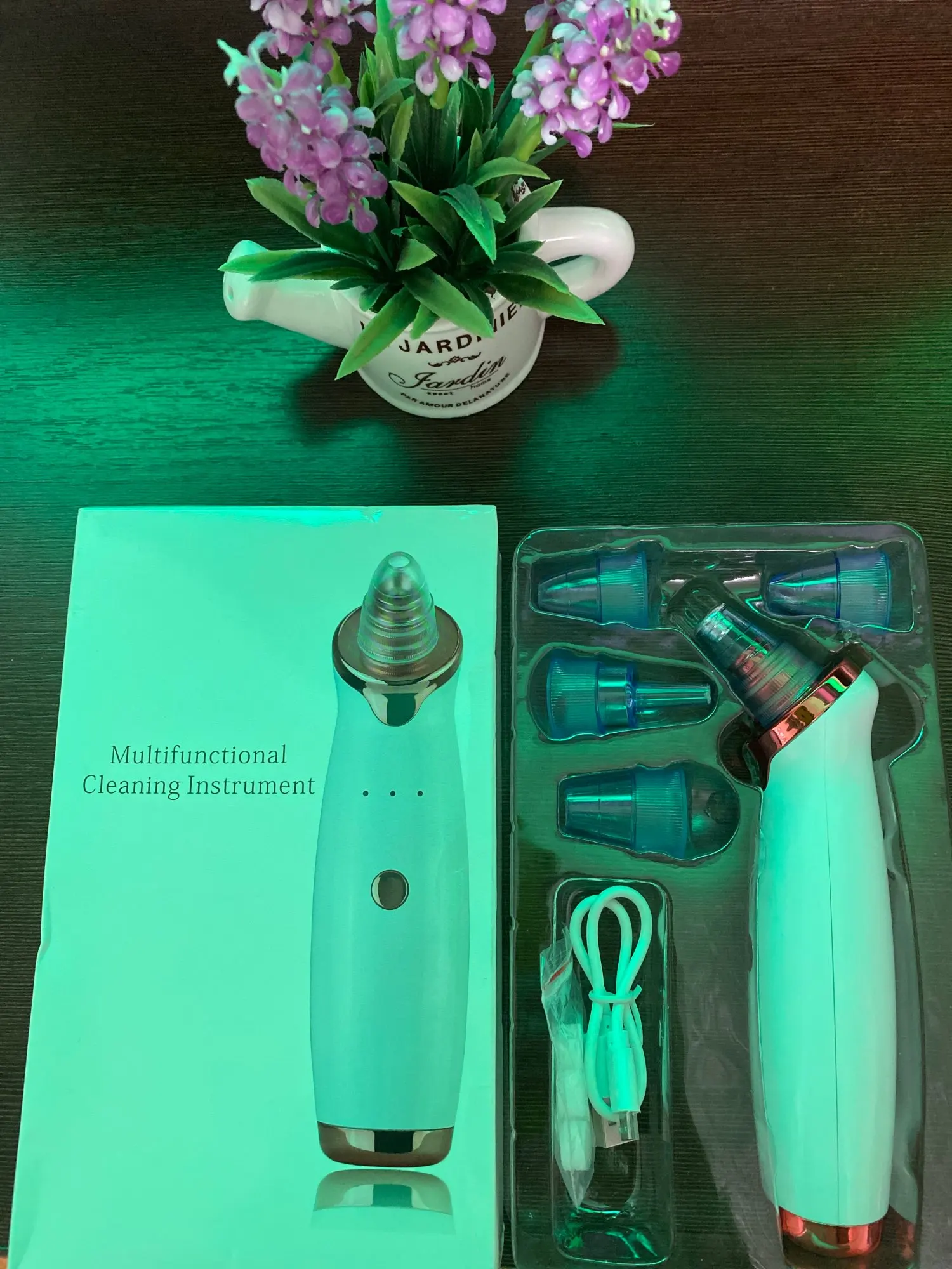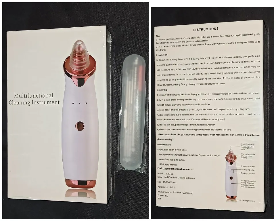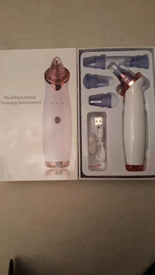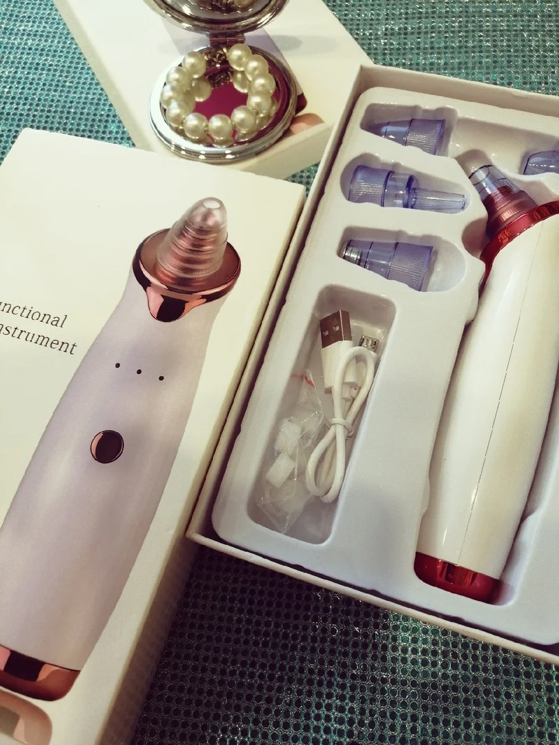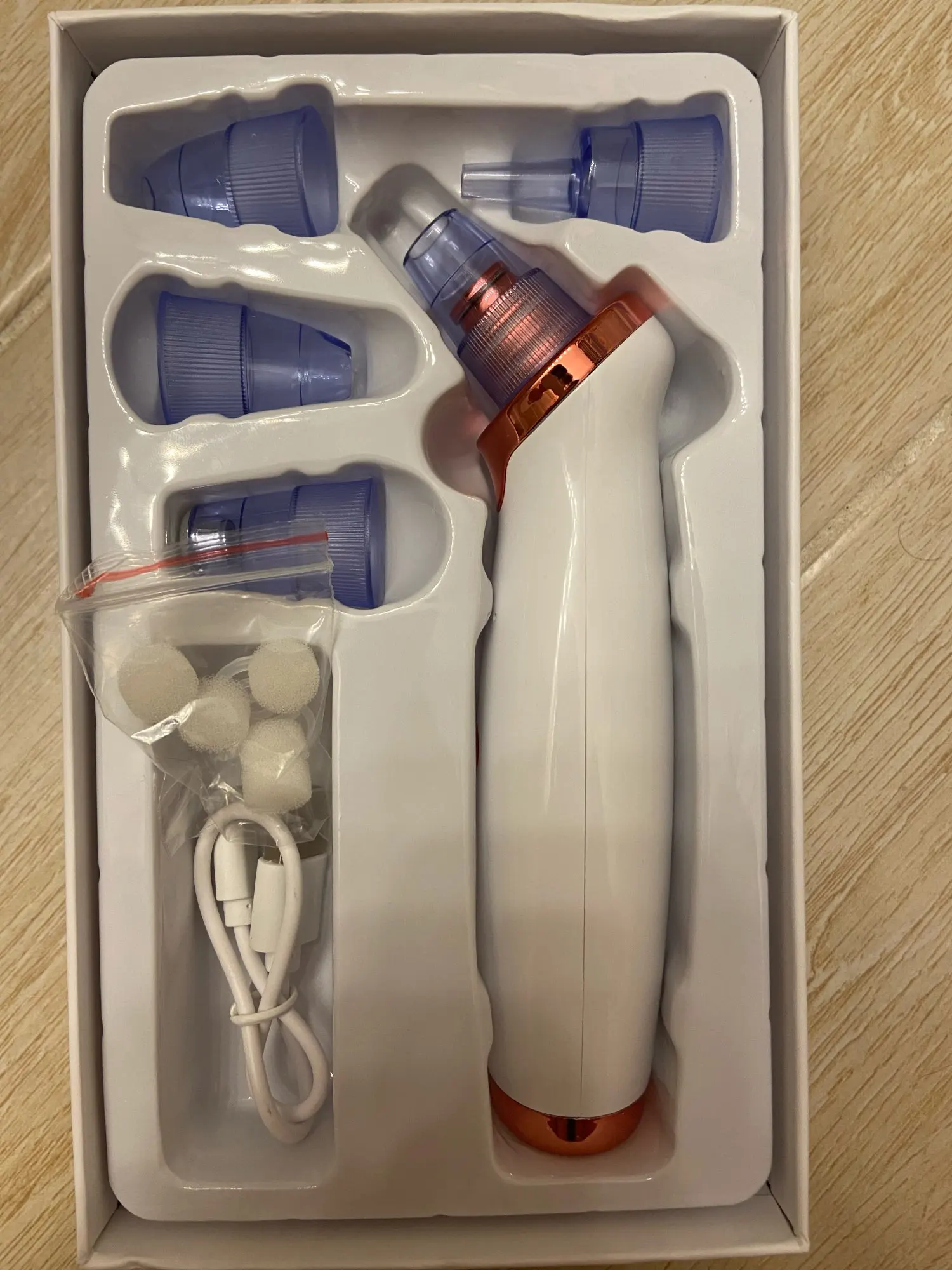 Точное описание! Комплектность полностью соответствует: 5 насадок, шнур для зарядки, сменные кольца и фильтры. На коробке описание, как использовать, была запаяна плёнкой. Имеется три режима, но даже первый очень сильно вытягивает. Посылку отправили быстро, продавец продлевал защиту, достойный. Отправил также иглы, приятно удивлена. Единственное, "пылесос" с красной отделкой, а не розовое золото. Рекомендую