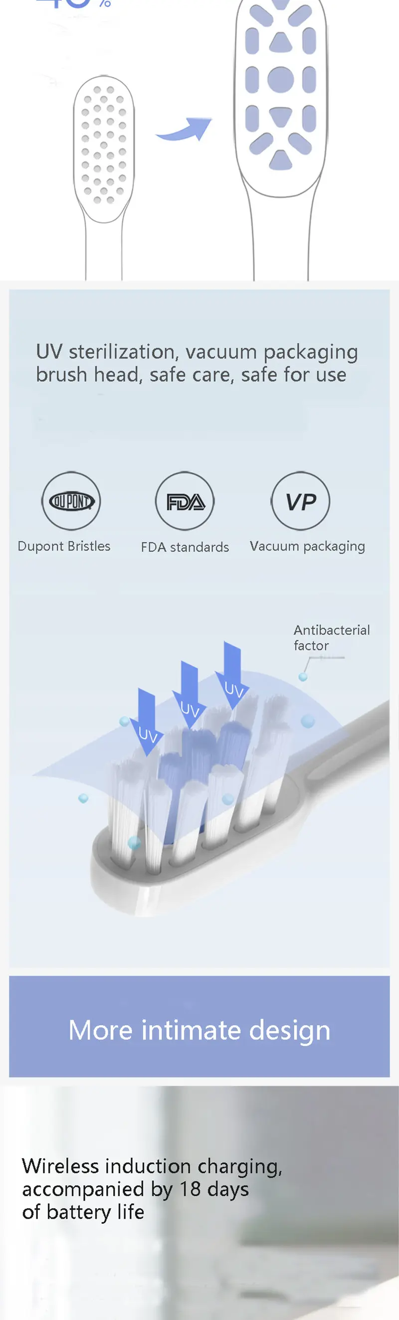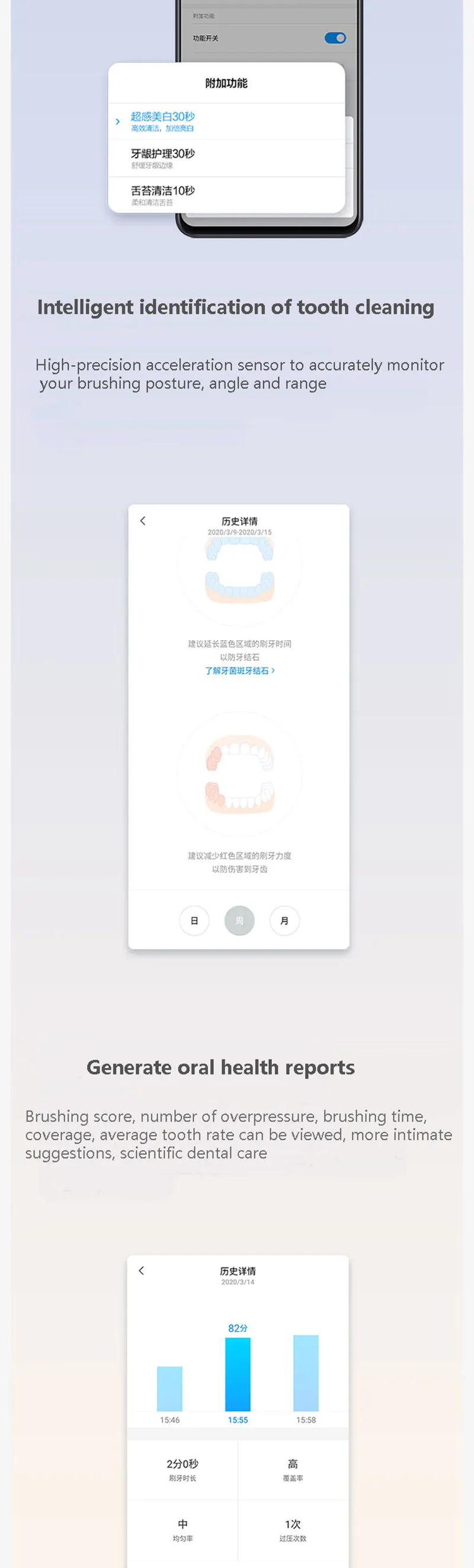 * Приложение персонализированный пользовательский режим чистки зубов, напоминание датчика давления, высокочастотный вибромотор, беспроводная Индукционная зарядка