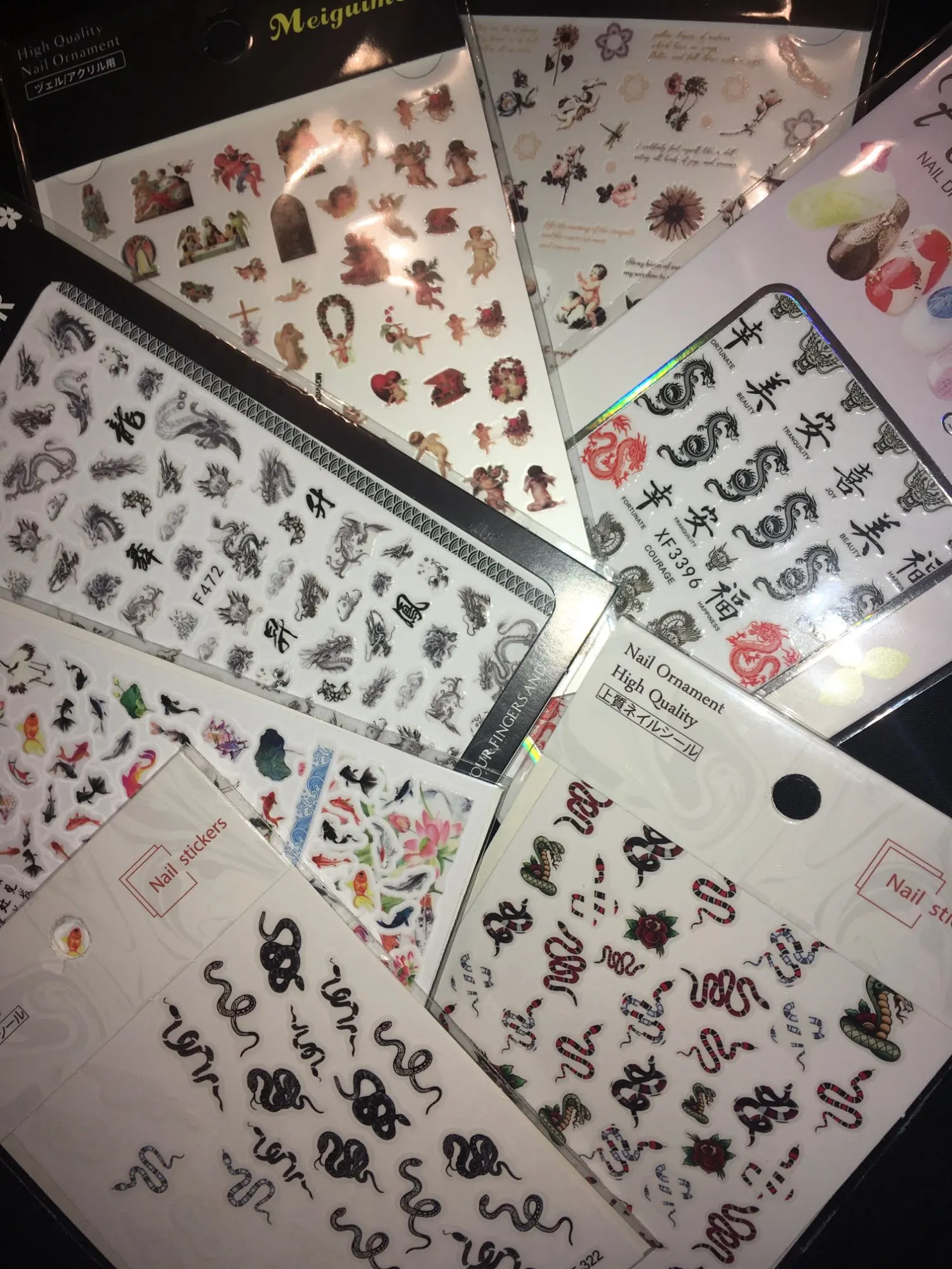 ужасно недовольна. я конечно понимаю что за такую маленькую цену не стоит ожидать чего-то крутого но мне пришёл АБСОЛЮТНО не тот заказ. 1 фото того что я заказывала 2 фото это то что мне пришло мало того что наклейки совершенно кривые так они ещё не чб. там розочки какие-то, змеи которые не поместятся даже на ноготь большого пальца ноги, где-то не пропечаталось совсем. может я действительно что-то не понимаю но любой дурак увидит то что это РАЗНЫЕ наклейки буду требовать возврат