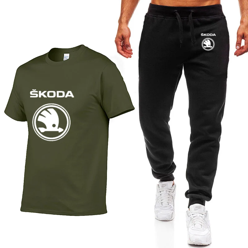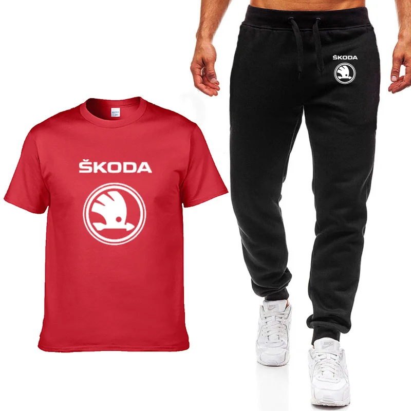 Мужской повседневный костюм с футболкой и брюками Skoda, хлопковая футболка с коротким рукавом и круглым вырезом, с принтом логотипа машины, костюм из 2 предметов