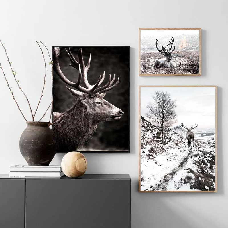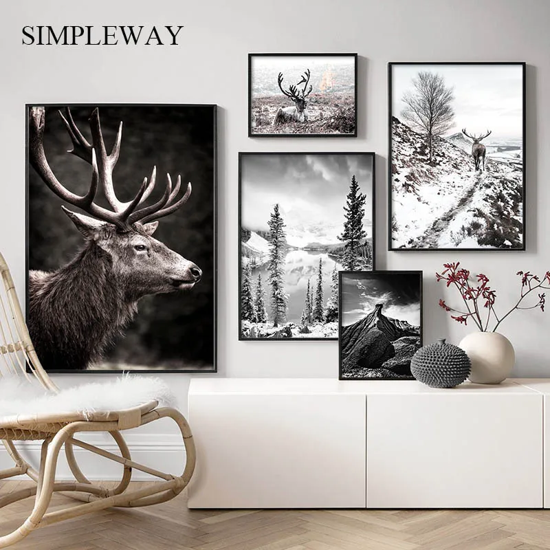 Скандинавский туман лес олень животное холст настенная живопись гор...