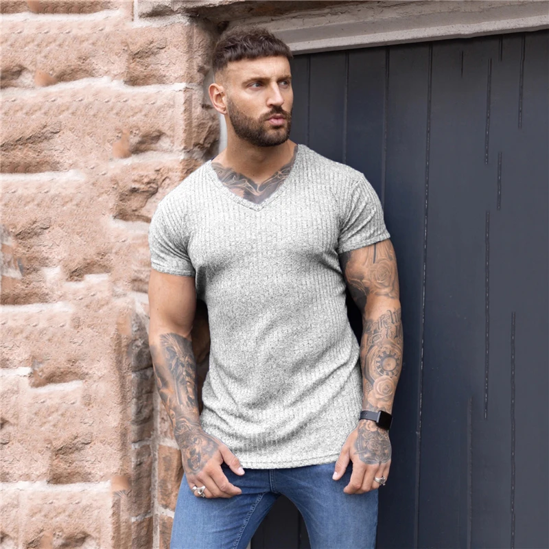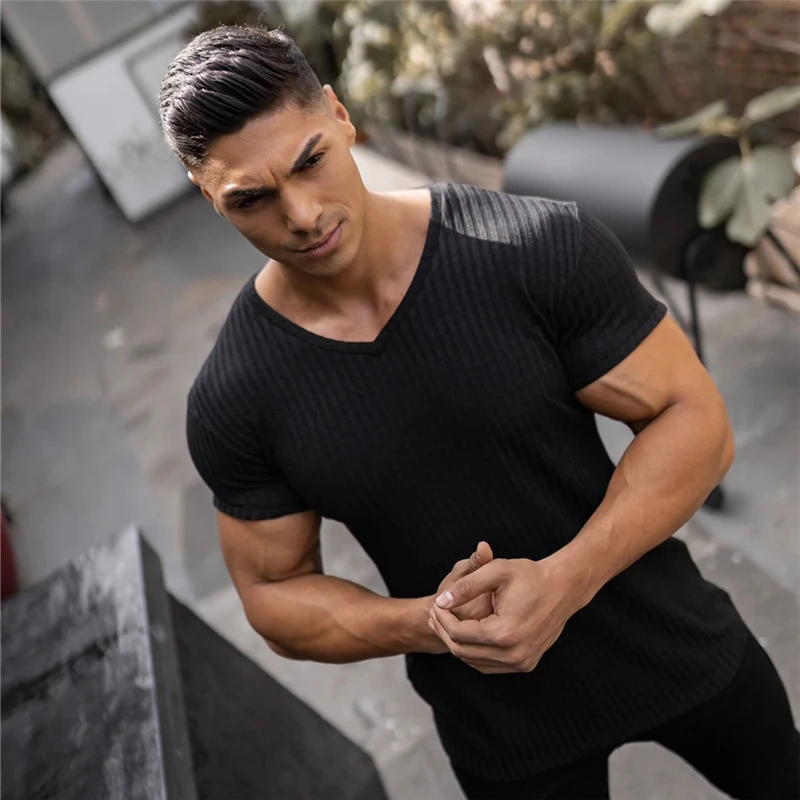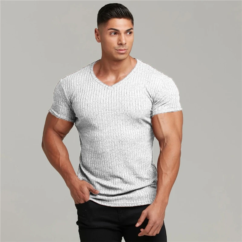 Футболка мужская Трикотажная с V-образным вырезом, облегающая Модная рубашка, пуловер с короткими рукавами, трикотажная одежда для фитнеса, лето