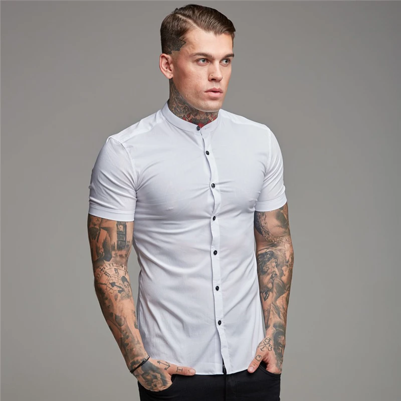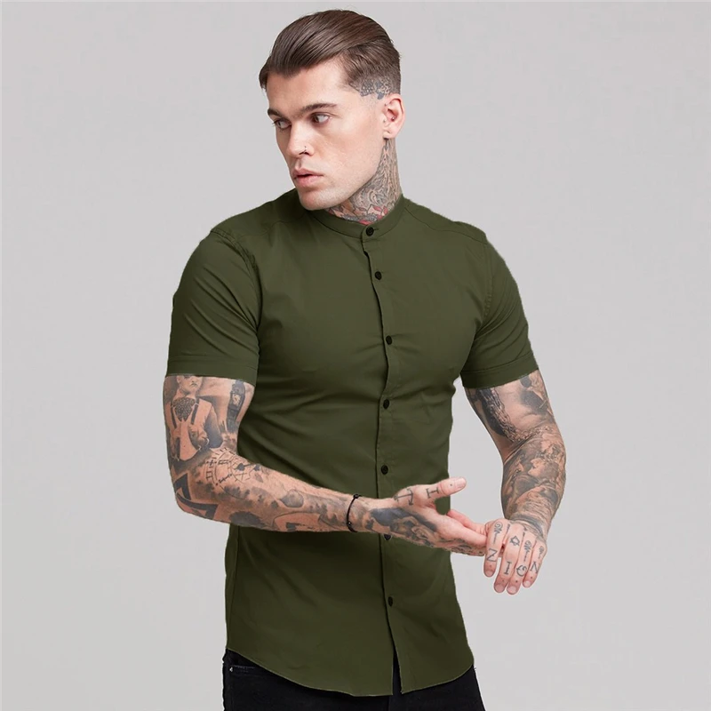Мужская рубашка с коротким рукавом, однотонная, для фитнеса, с воротником-стойкой