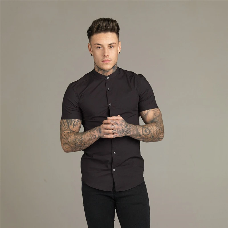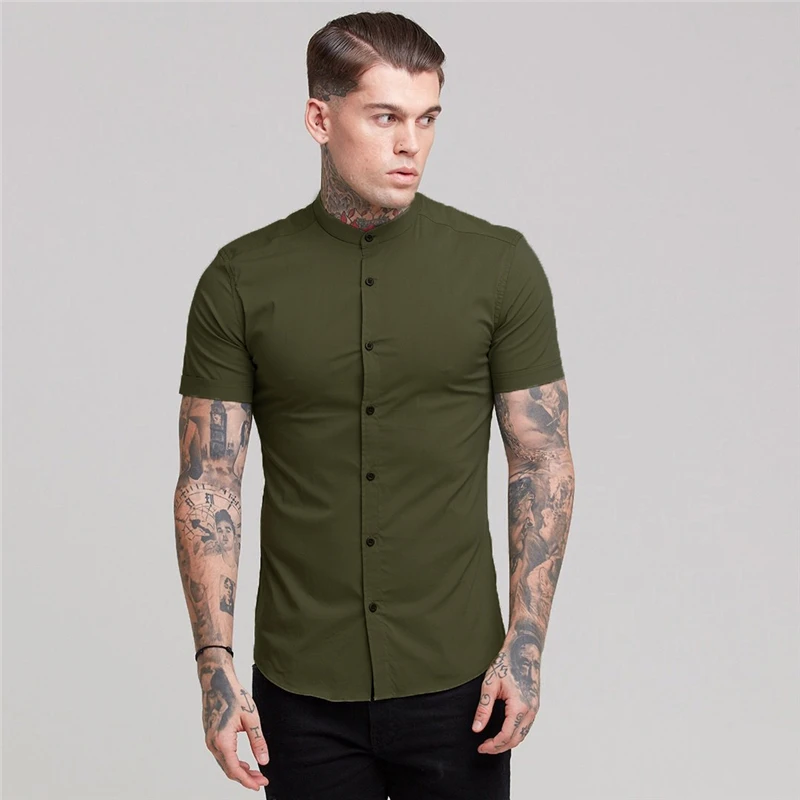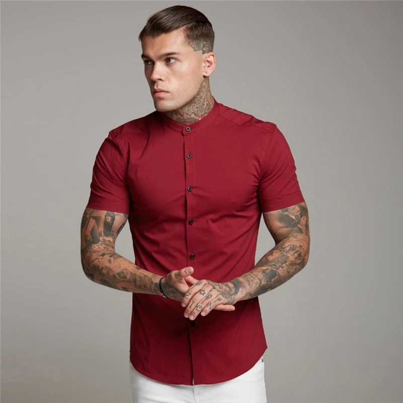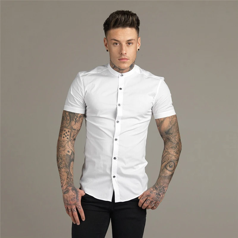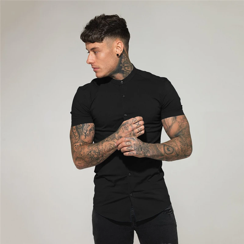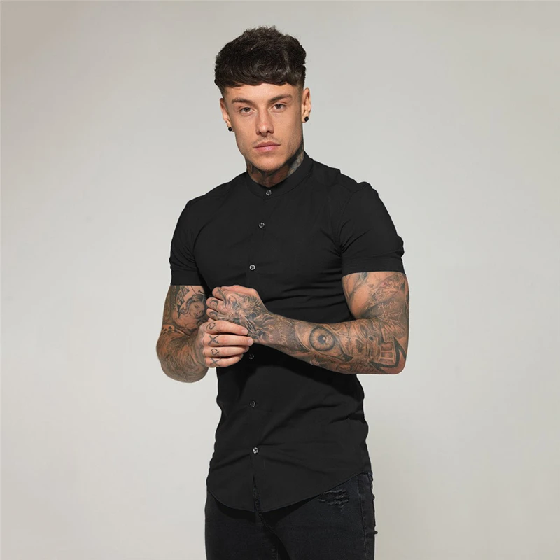 Новая летняя Мужская модная Однотонная рубашка с коротким рукавом, приталенная мужская деловая рубашка, брендовая мужская спортивная одежда для тренажерного зала, фитнеса