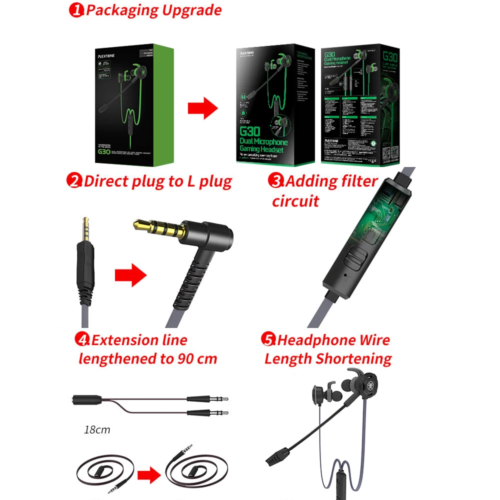 Компьютерные игровые наушники с микрофоном PCГеймерская Гарнитура на мобильный телефон PS4 New Xbox OneТехнические характеристикиБренд: PlextoneМодель: игровые наушники G30 In-earЧастотная характеристика: 15-21 кГцДиаметр динамика: 8 ммДиафрагма для динамика Толщина: 9 μЧувствительность: 106 дБСопротивление: 16 ΩДлина кабеля: накопительная 2,2 м (+ адаптер Длина кабеля)Текстура проволоки: TPE экологически чистые материалы + с бескислородной медной сердцевиной OFCС микрофоном: Да (съемный микрофон)Стандарт Вилки: 3,5 мБесплатный подарок: 3,5 мм разъем от 1 до 2 Кабель-адаптер