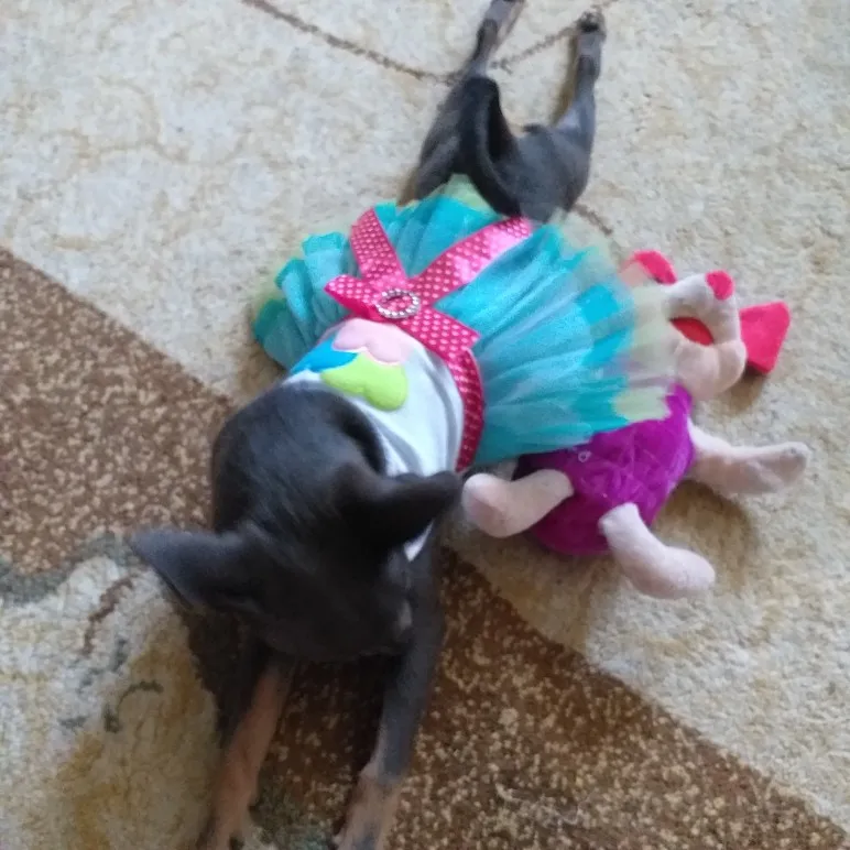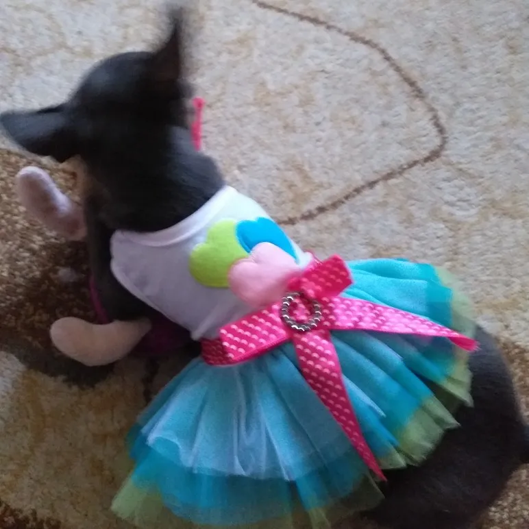 Платье для моей собаки подошло. Чихуахуа вес 3 кг. В реалии юбка не соответствует фото, менее пышная. Но в общем платье симпатичное.