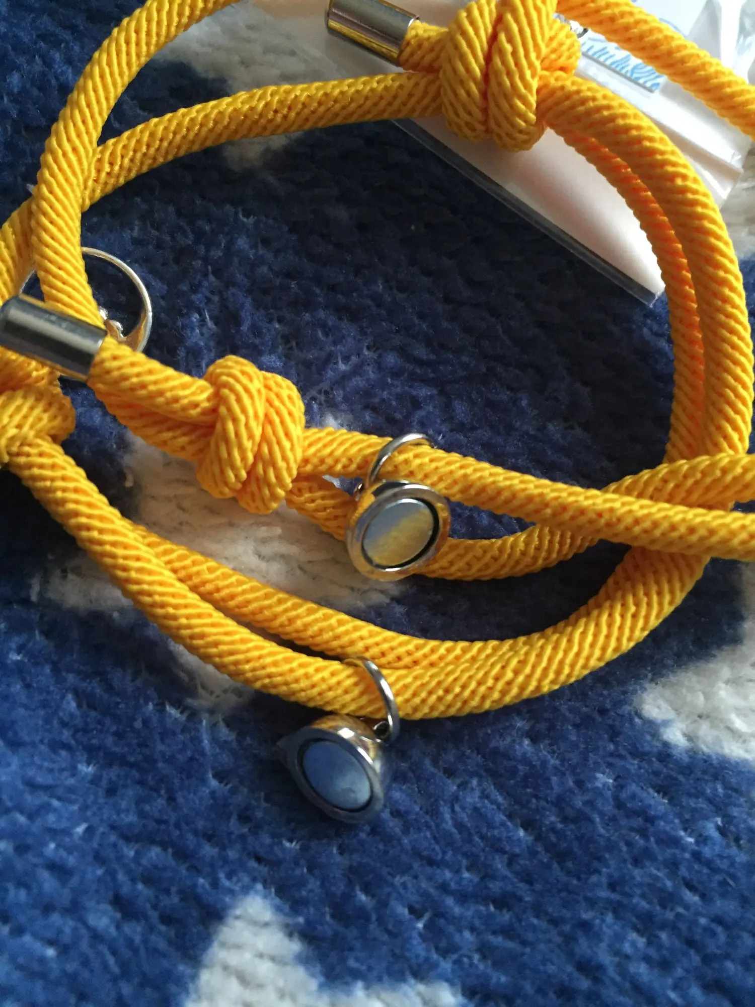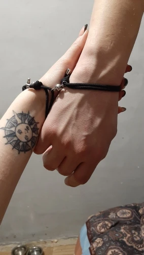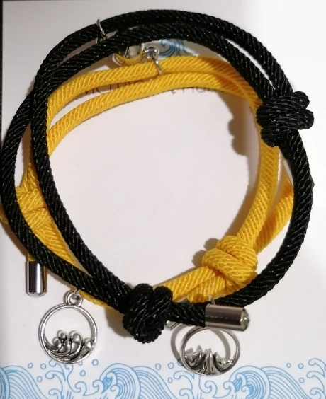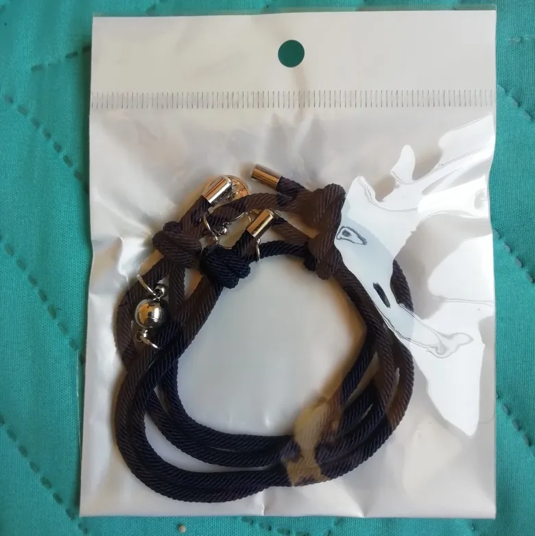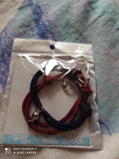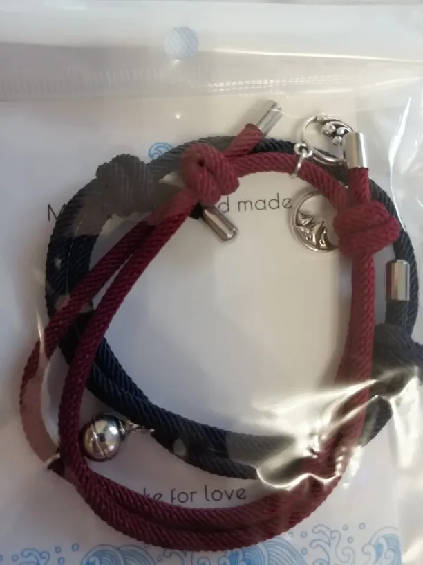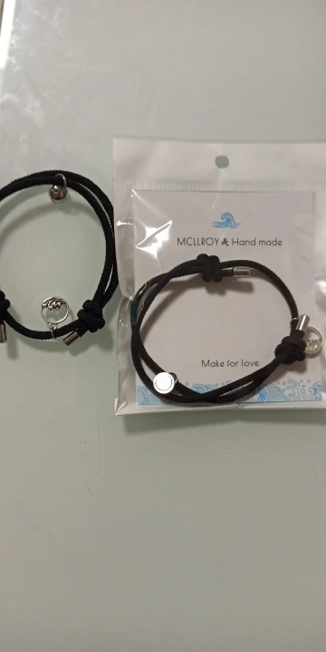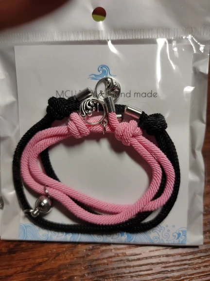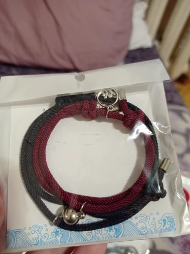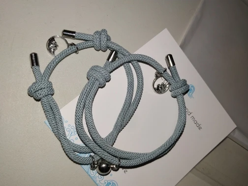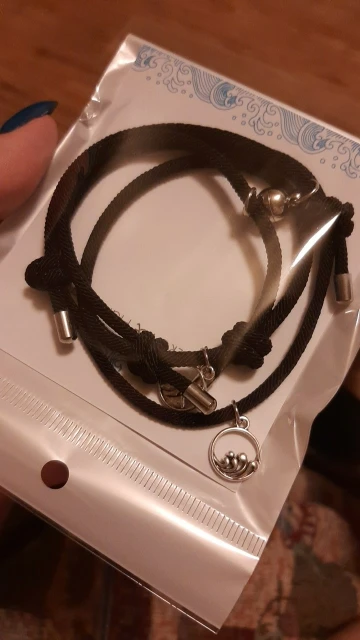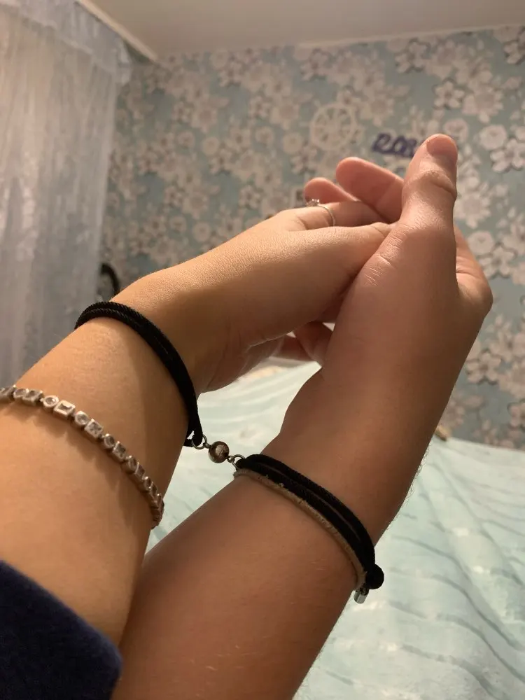 Очень красивые парные браслеты. Давно искала что-то на подобие. Сделаны аккуратно, как по мне качественно. На шнурочках железные наконечники, так что разойтись не должны. Магниты хорошие, держатся хорошо и крепко , притягиваются тоже сразу. Очень понравились доп. украшение на местк где регулируется размер. Рекомендую.