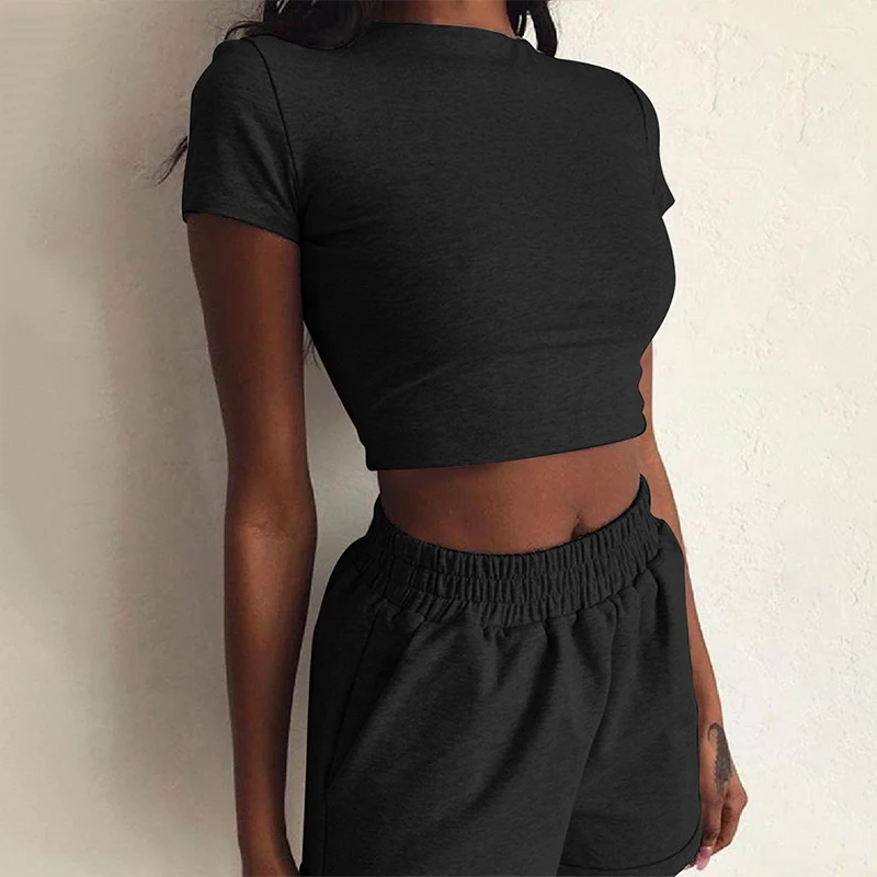 Женский комплект из 2 предметов, уютный спортивный комплект для фитнеса, однотонный укороченный топ с круглым вырезом и коротким рукавом, комплект с шортами с высокой талией