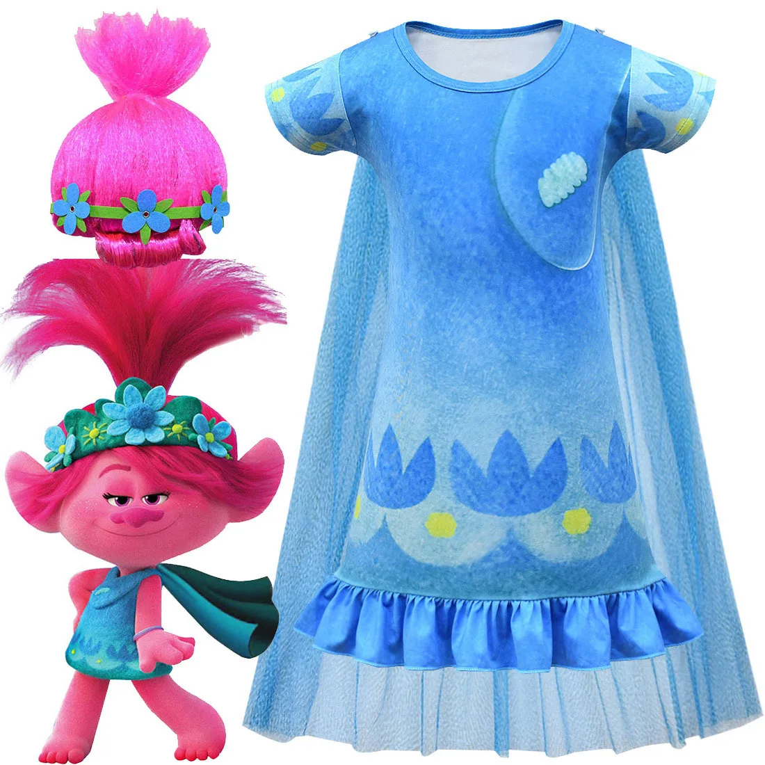 Рождественский карнавальный костюм; Детвечерние кружевное платье с рисунком троллей; Одежда для маленьких девочек; Детская парик для троллей; Vestidos