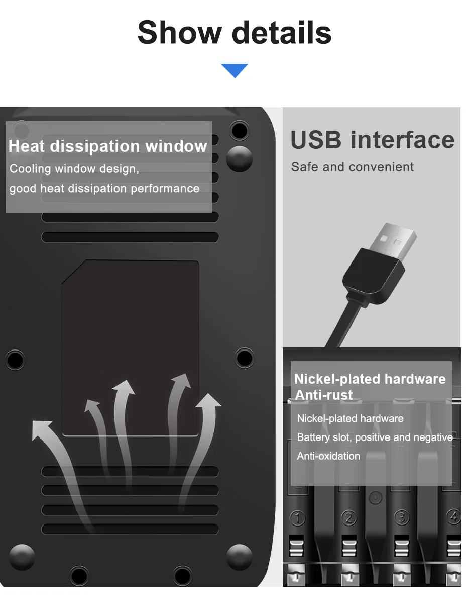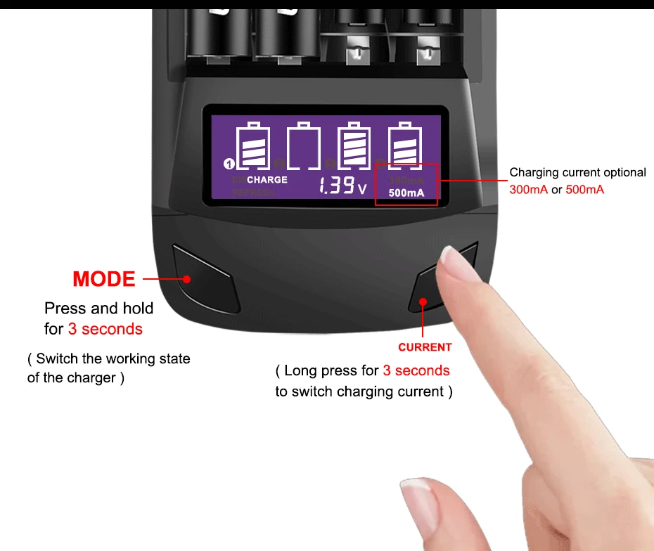1. Зарядное напряжение и ток: 300mA или 500mA, 1,2 V 500mA * 4 или 1,2 V 300mA * 4.2. Разрядное напряжение и ток: 300mA или 500mA, критическое разрядное напряжение 0,9 V.3. Перезаряжаемый аккумулятор Тип: для 1,2 V AA, AAA, никель-металл-гидридного или гидридных и никель-кадмиевых типов аккумуляторов перезаряжаемый аккумулятор, Не заряжать литиевая батарея или одноразовый аккумулятор.4. Кнопка режима: Переключайте режим работы зарядного устройства, по умолчанию используется режим зарядки, нажмите и удерживайте кнопку 2 секунды, чтобы переключиться на режим разрядки или режим обновления.5. Кнопка тока: Нажмите и удерживайте кнопку 2 секунды, чтобы переключить ток заряда или постоянный ток на 300 мА или 500 мА.6. После ввода зарядки нажмите кнопку MODE, чтобы просмотреть напряжение каждого аккумулятора.7. Умный чип может разумно определить плохой аккумулятор или не перезаряжаемый аккумулятор и подсказать пользователю.8. Зарядное устройство поставляется с usb-кабелем для зарядки, материал-медный сердечник, не будет высокой температуры при использовании большого заряда тока, небольшие потери зарядки.9. Зарядка через USB, с интерфейсом Micro-USB и Type C, по всему миру, для любой страны.10. Материал зарядного устройства сам по себе является огнестойким сырьем, теплом и высокой температурой, максимальной температурной защитой 65 °C.11. ЖК-смарт-зарядное устройство обновленная версия, батарея легко выбрать и разместить, может переключаться на высокий ток заряда или разряда, напоминает форма спортивной машины, хороший выбор для подарка.