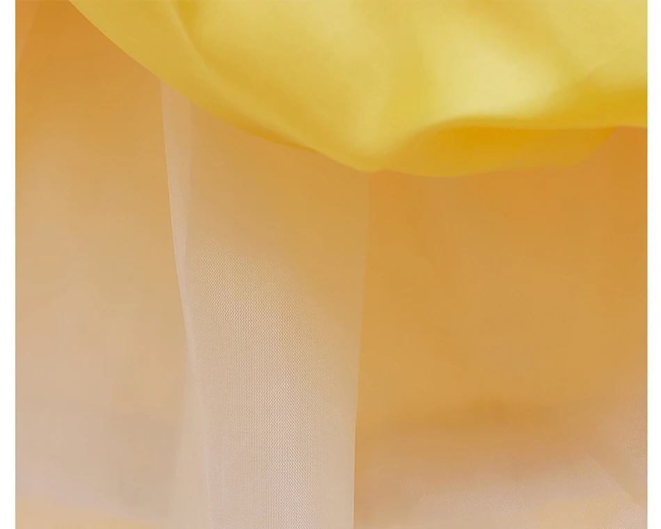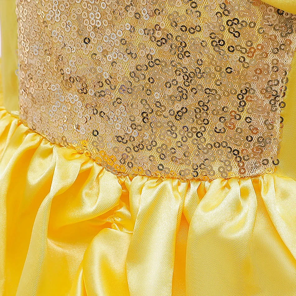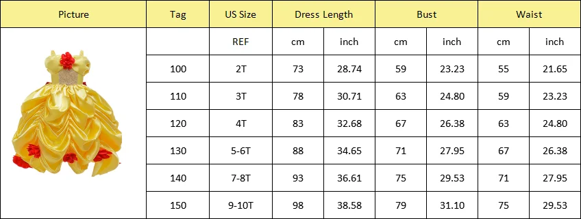Цвет: желтыйРазмер: 100-110-120-130-140-150Возраст: 2T, 3T, 4T, 5, 6, 7, 8, 9, 10Материал: атлас, другая тканьАксессуар: палочка, перчатки, корона, ожерелье, плащ, парикПарик: это лучше для девочки 4T или большеТема: Бель платье, пачка, свадебное платье, вечерние, подарок на день рождения