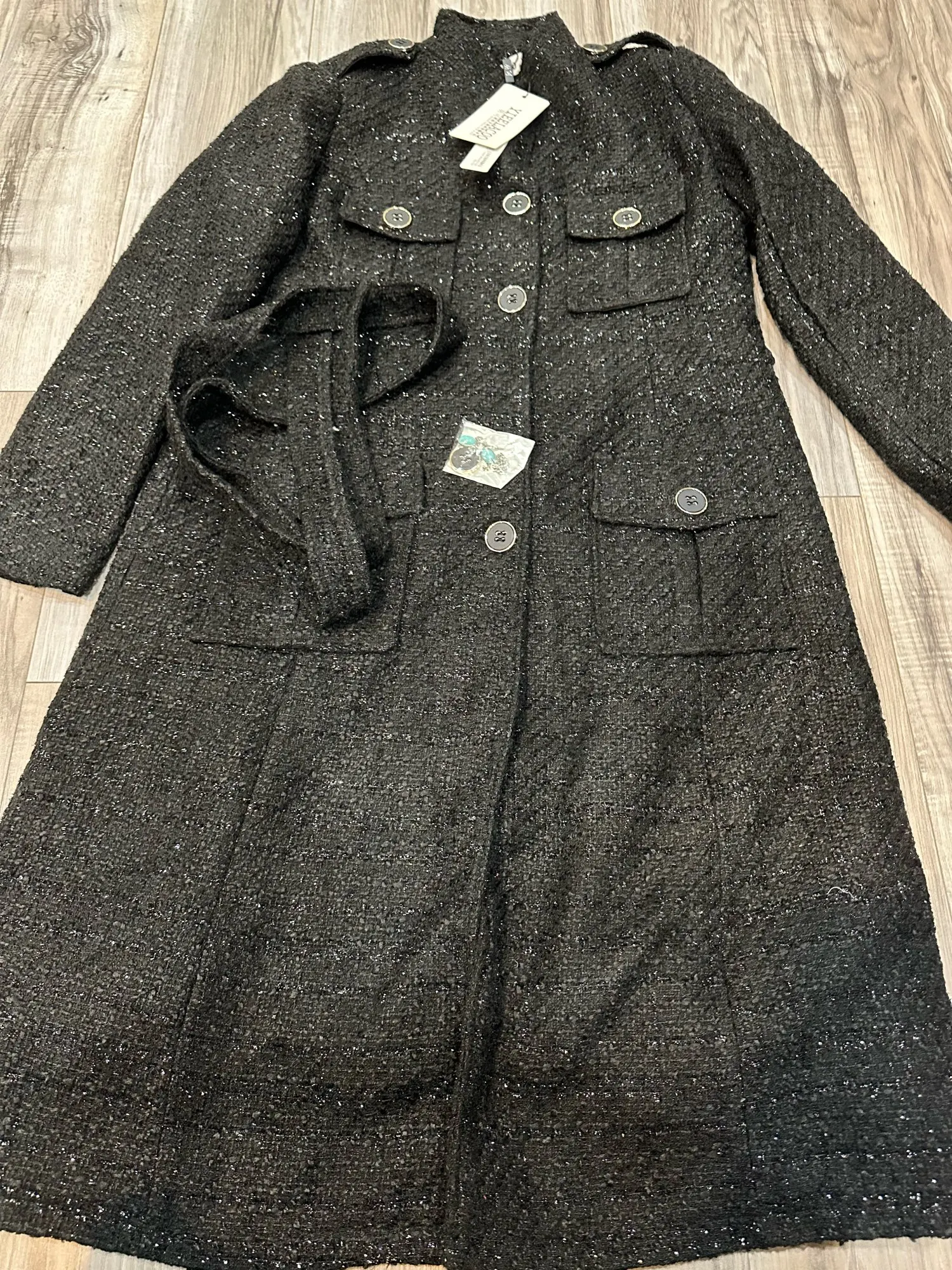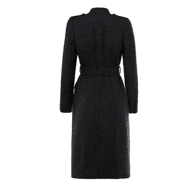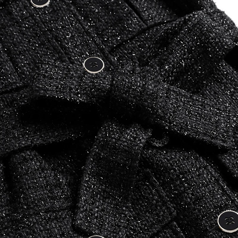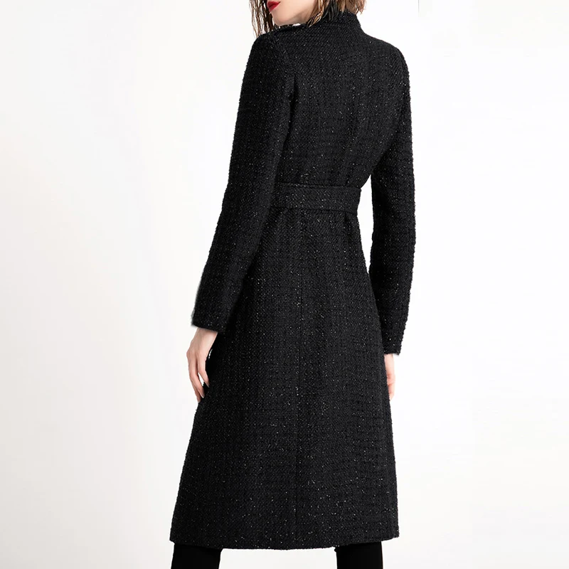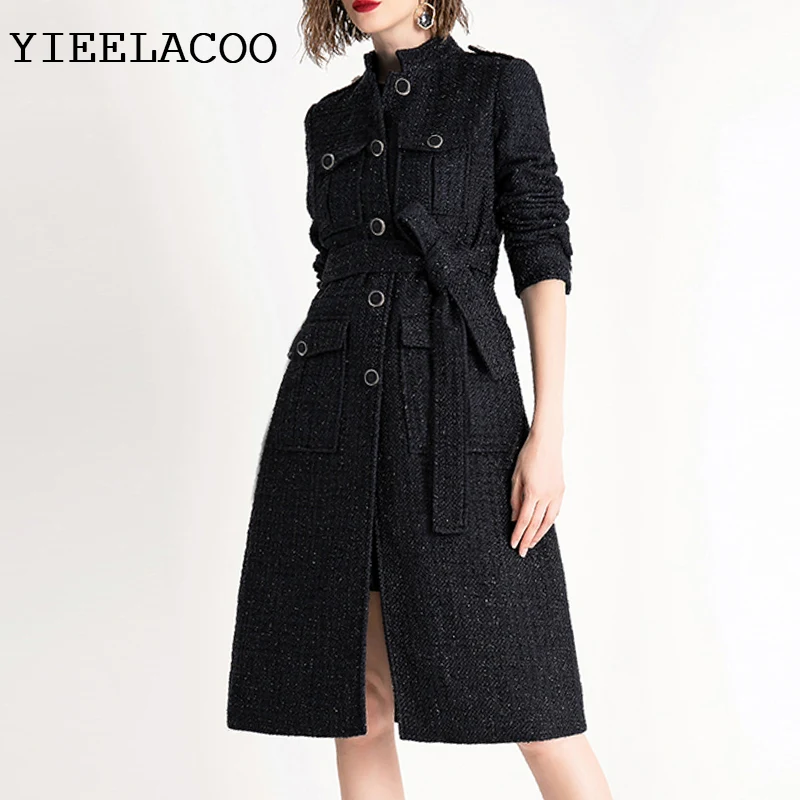 Черное твидовое пальто, длинное женское пальто на осеньзиму, куртка, деловая Женская цельная куртка из твида с яркой обмоткой